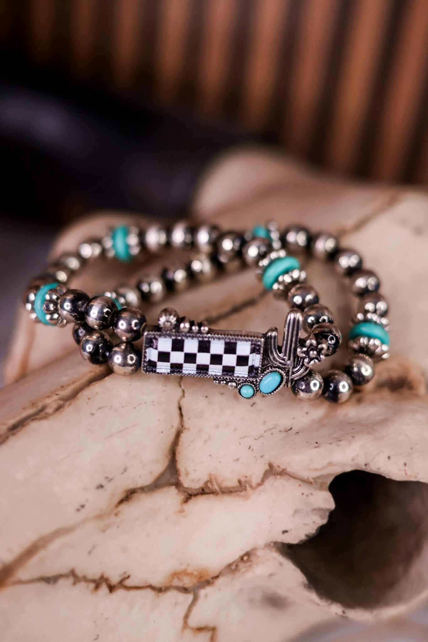 Add a pop of charm and color with this 2 layered stretch bracelet! Featuring shiny silver and vibrant turquoise beads, it’s accented by a cool rectangular black and white checkerboard stone and a cute cactus charm. Easy to wear and perfect for playful, everyday style that stands out.