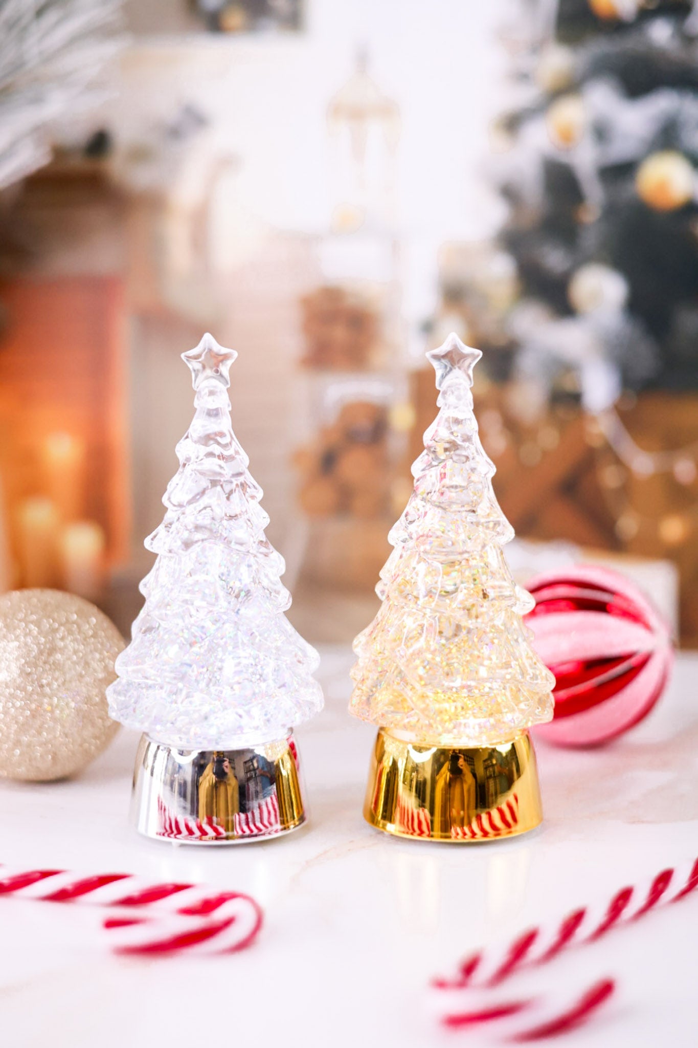 Add a touch of festive magic with this 5" Light Up Swirling Glitter Christmas Tree. Available in shimmering silver or radiant gold, the clear tree sparkles as glitter swirls inside, creating a mesmerizing holiday glow. Perfect for brightening any room with playful holiday cheer.
