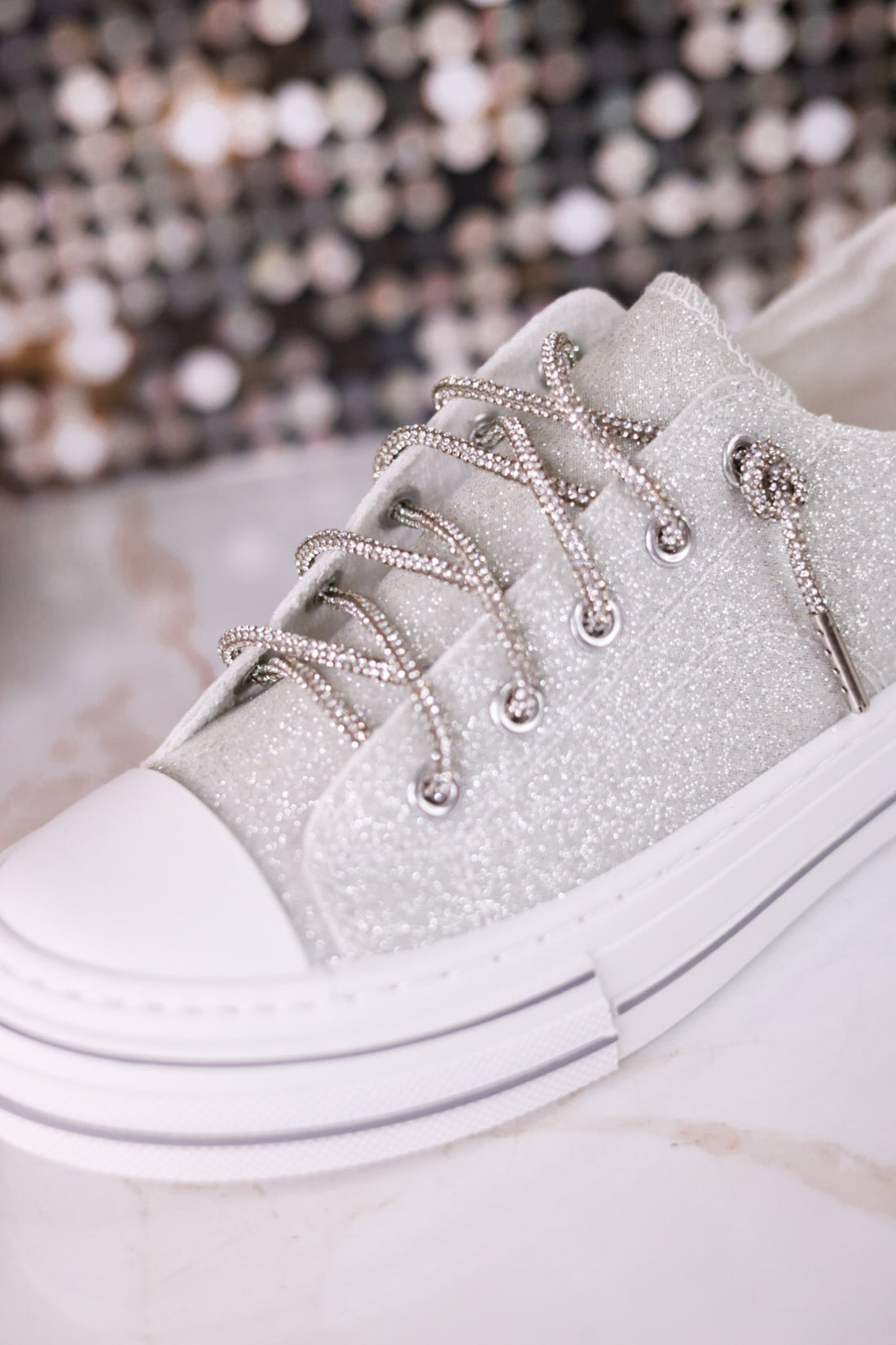 These throw back low profile slip-on sneakers dazzle with a silver sparkle body and matching rhinestone laces! The soft footbed makes every step feel like a cloud, combining comfort with a flash of fun. Perfect for adding a bit of sparkle to your day without any fuss.