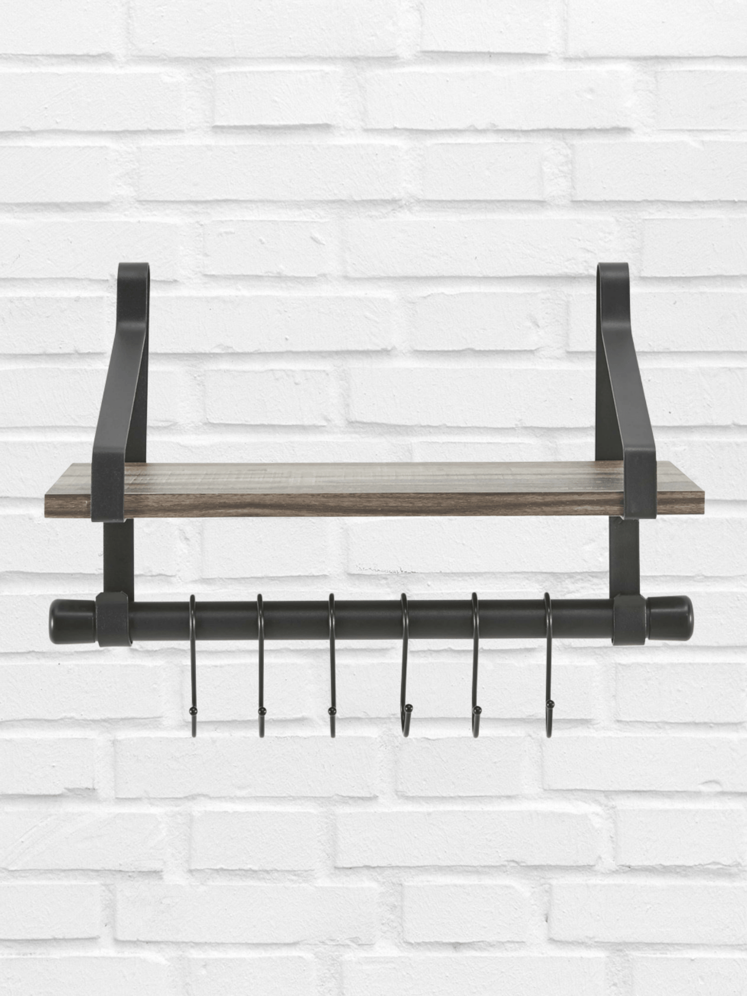 Simple yet stylish, the Utility Shelf with Rod and Hooks is a fashionable way to store and display necessities. The elegant combination of distressed wood laminate and black iron offers an eye-catching rustic-industrial appeal. The top shelf provides ample space for display and storage while the six removable hanging hooks can be used to hang towels, oven mitts, kitchen utensils, keys, scarves, necklaces, hats, gloves, tote bags and more. The perfect decorative and functional accent for your entryway, kitchen, bathroom or closet!