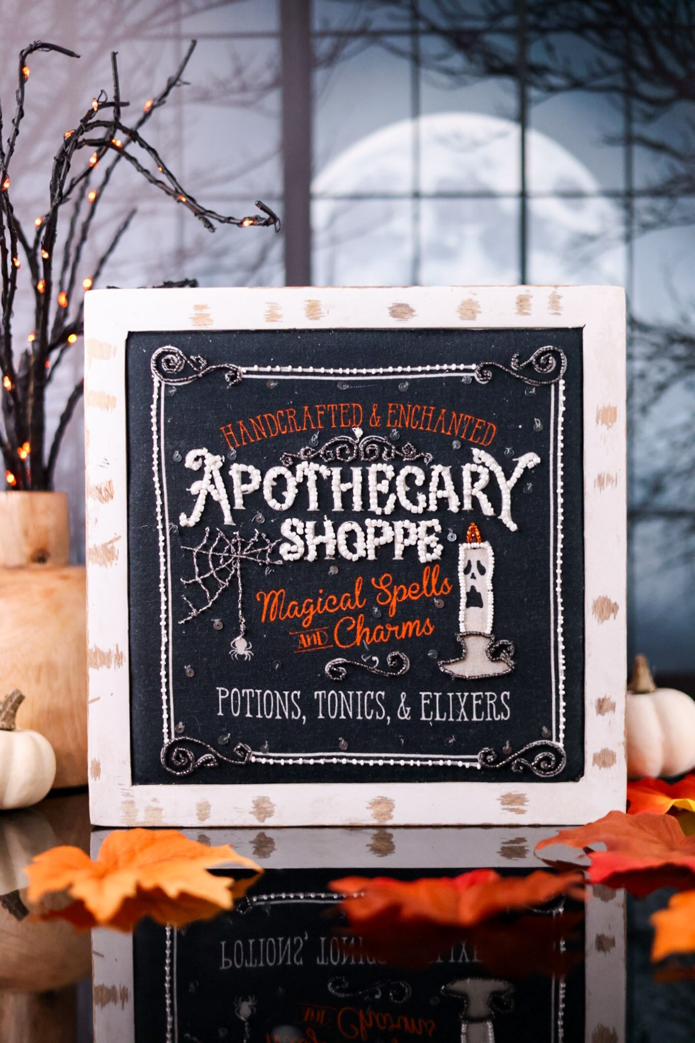 Add a spooky twist to your décor with the Apothecary Shoppe Wall Art. Featuring a wood frame and beaded fabric art, this playful piece brings a touch of eerie charm and textured fun to your walls—perfect for those who love a little haunted whimsy!
