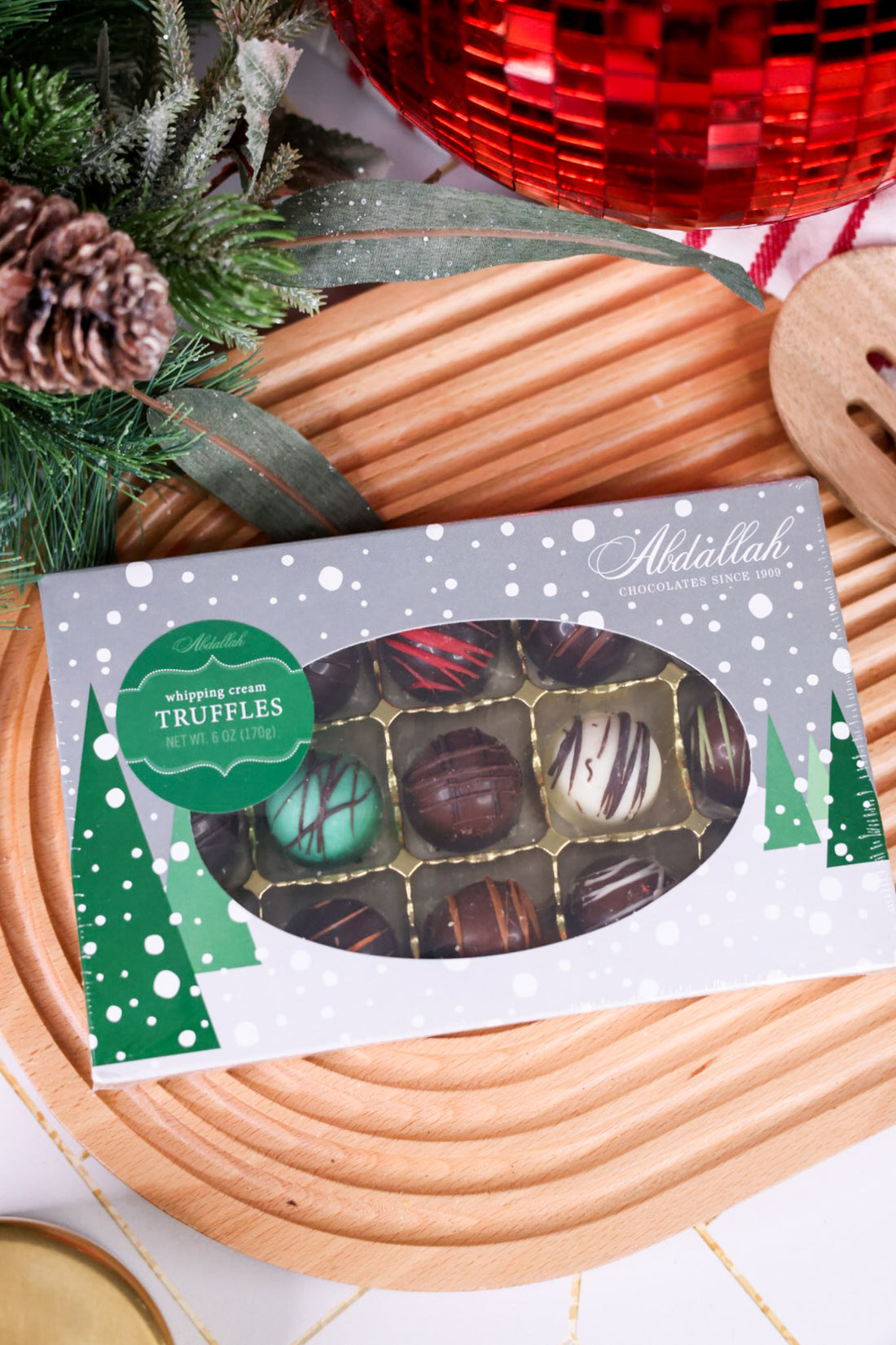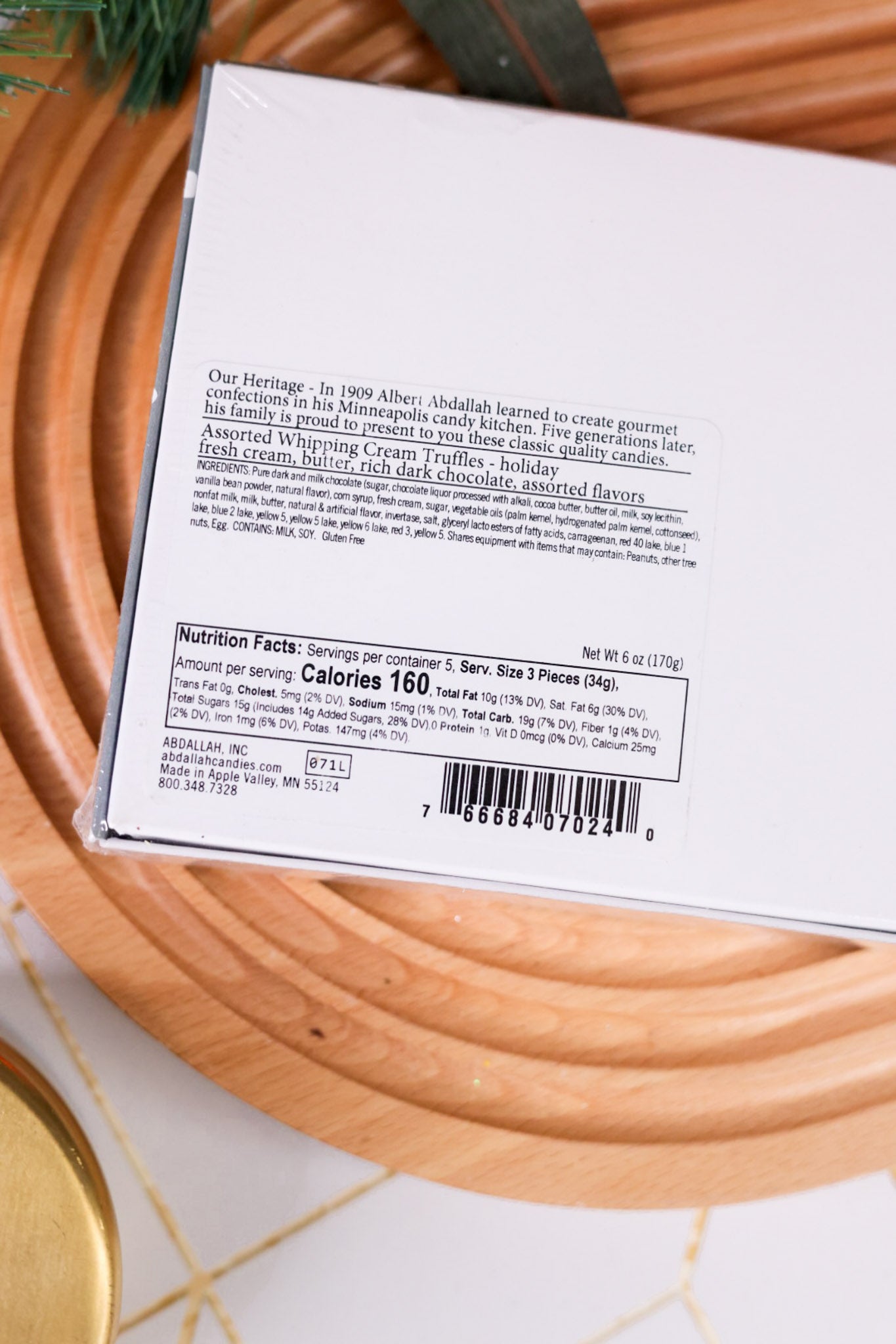 Unwrap the magic of the season with 15 whipping cream truffles in festive Christmas packaging. This collection features a delightful lineup of flavors—French silk, amaretto, champagne, creme de menthe, mocha, Irish cream, raspberry, double chocolate, rum, strawberry cheesecake, butter pecan. A playful gift that brings holiday cheer to every chocolate lover.