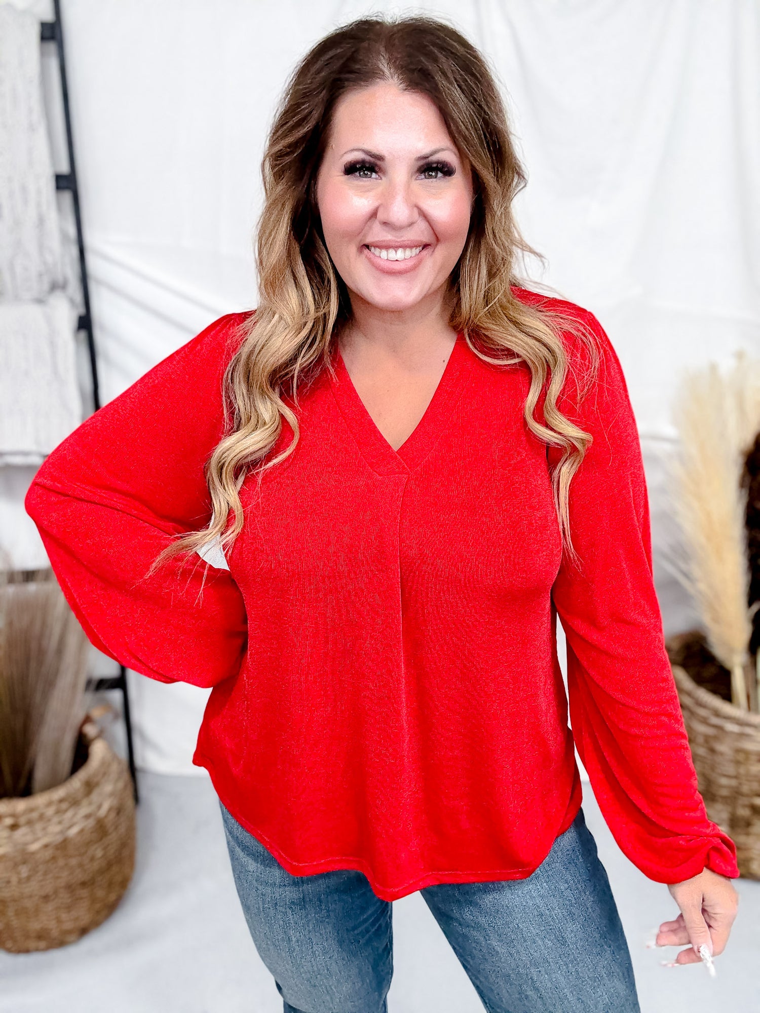 This vibrant red balloon sleeve top blends comfort with playful style. Its deep V-neck adds a flirty flair, while the balloon sleeves create a breezy silhouette. Made from lightweight fabric, it moves with you and suits any shape—perfect for adding a splash of fun to any outfit.