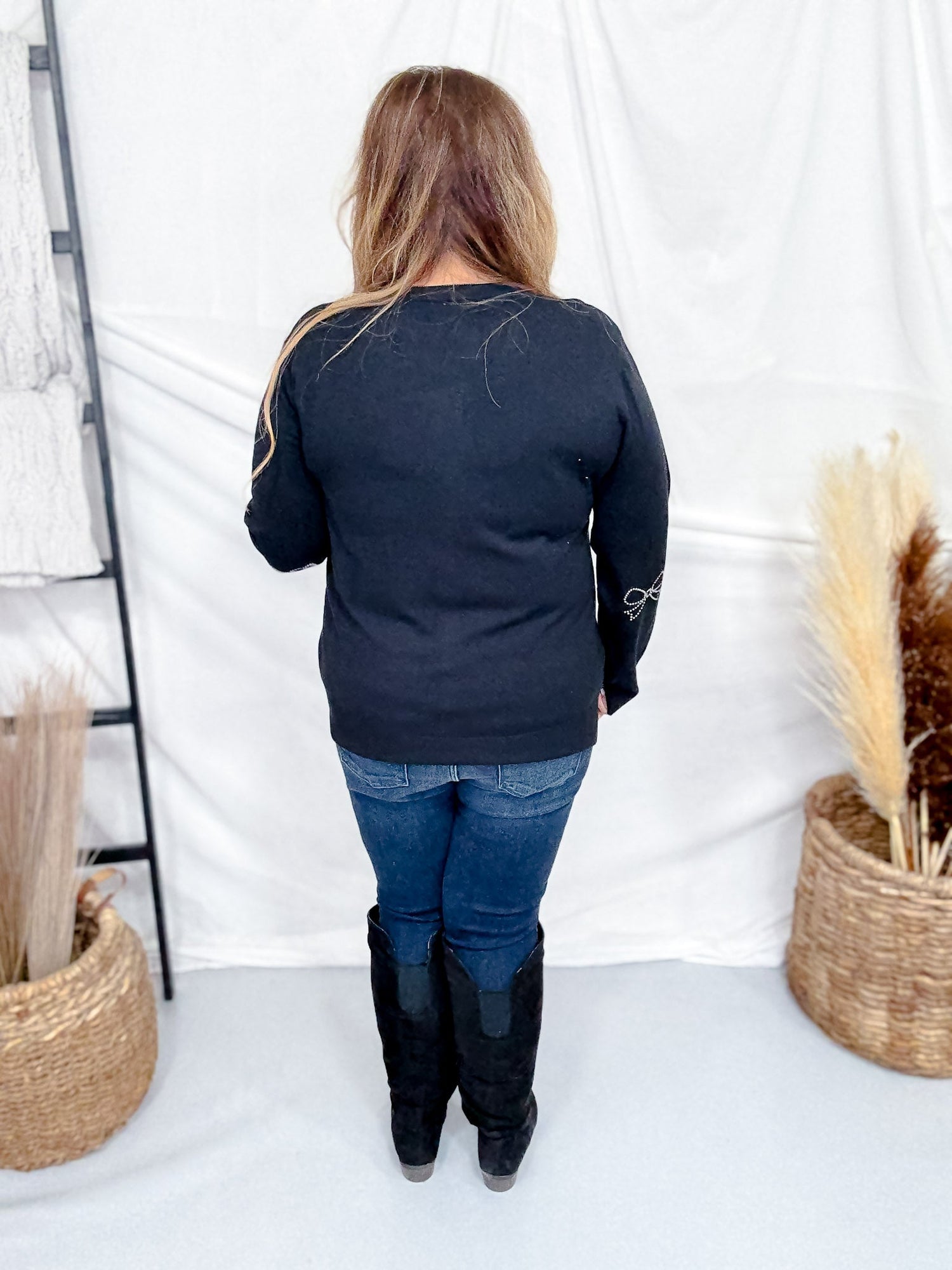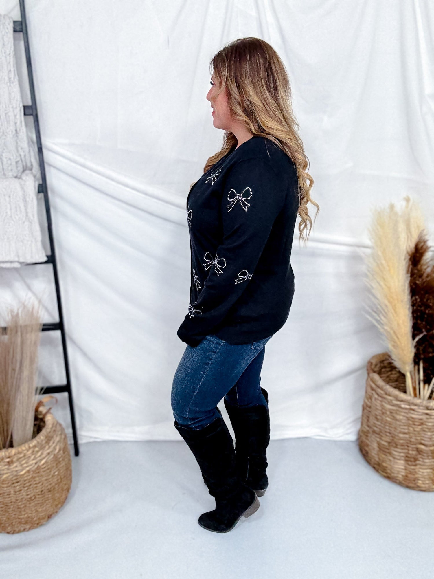 This knit cardigan brings a delightful touch of sparkle with rhinestone bow embellishments all over, perfect for adding charm to your everyday outfits. Its classic crew neckline and button-up front make it easy to style with jeans or skirts, offering versatility for many occasions.