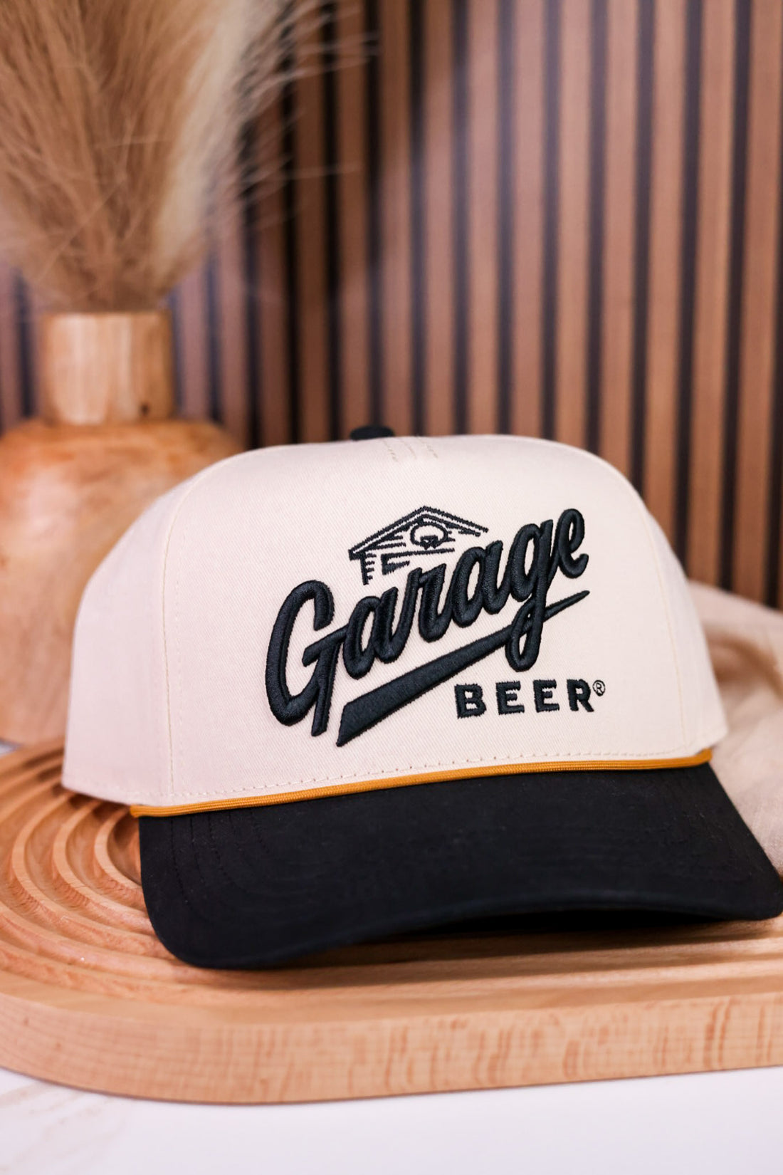 Cruise in comfort with the Garage Beer Trucker Hat—a cream crown featuring the bold black logo, black brim trimmed with a yellow rope detail. Snap closure adjusts to fit just right. Your new go-to for brewery runs and backroad adventures.