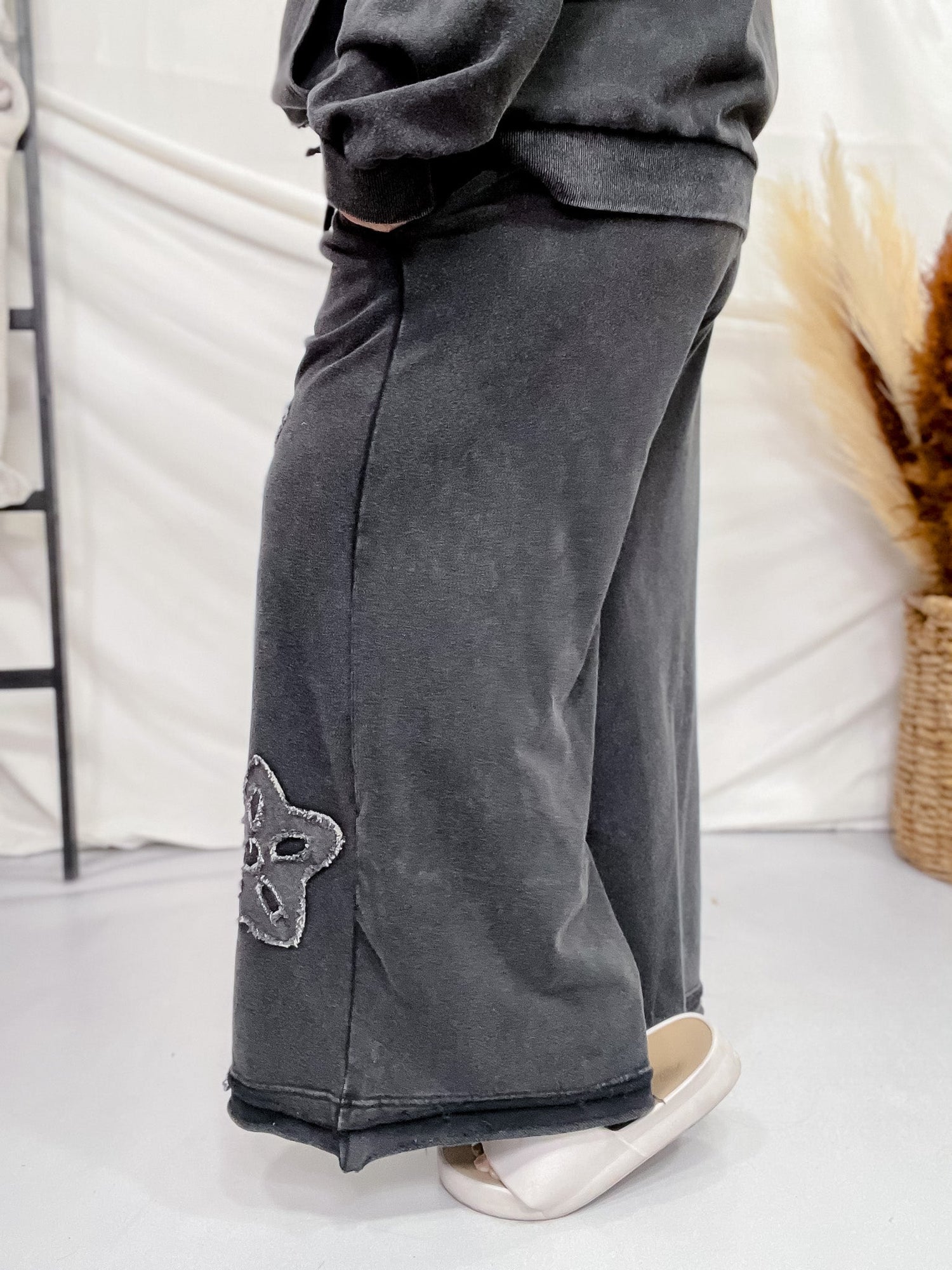 Black Flower Patch Acid Washed Palazzo Cropped Pants