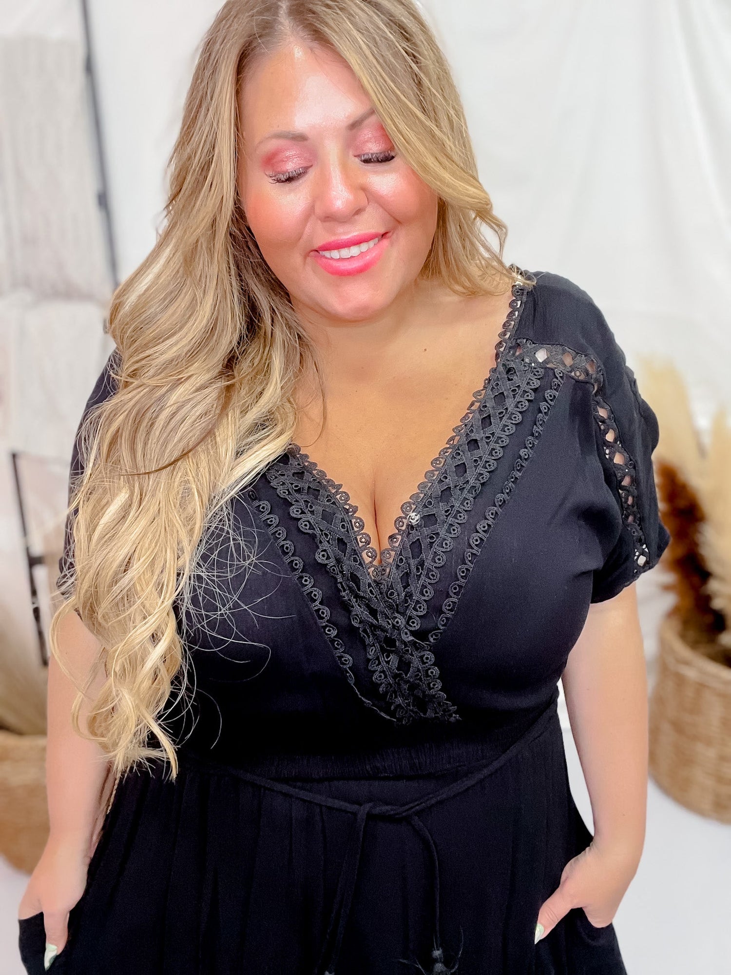 This adorable black dress comes with a smocked waist and mock ties on the sides. There is a snap closure for the bust and pockets to hold all of your goodies.