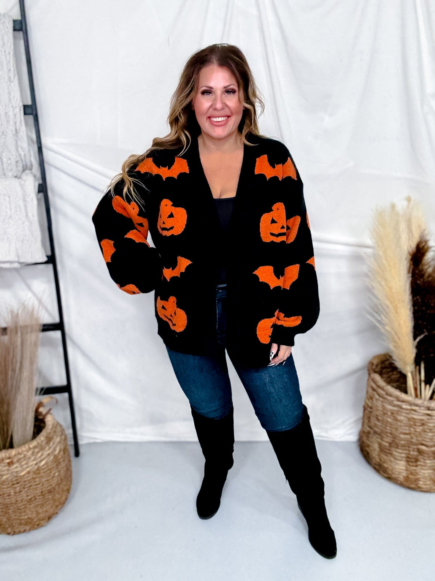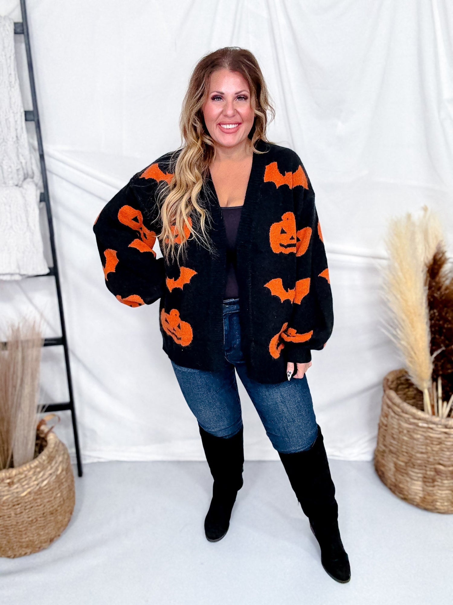 Get into the Halloween spirit with this black open front cardigan featuring a playful orange print of bats and jack-o-lanterns. Perfect for layering, it adds a fun, festive touch to any outfit while keeping you cozy.