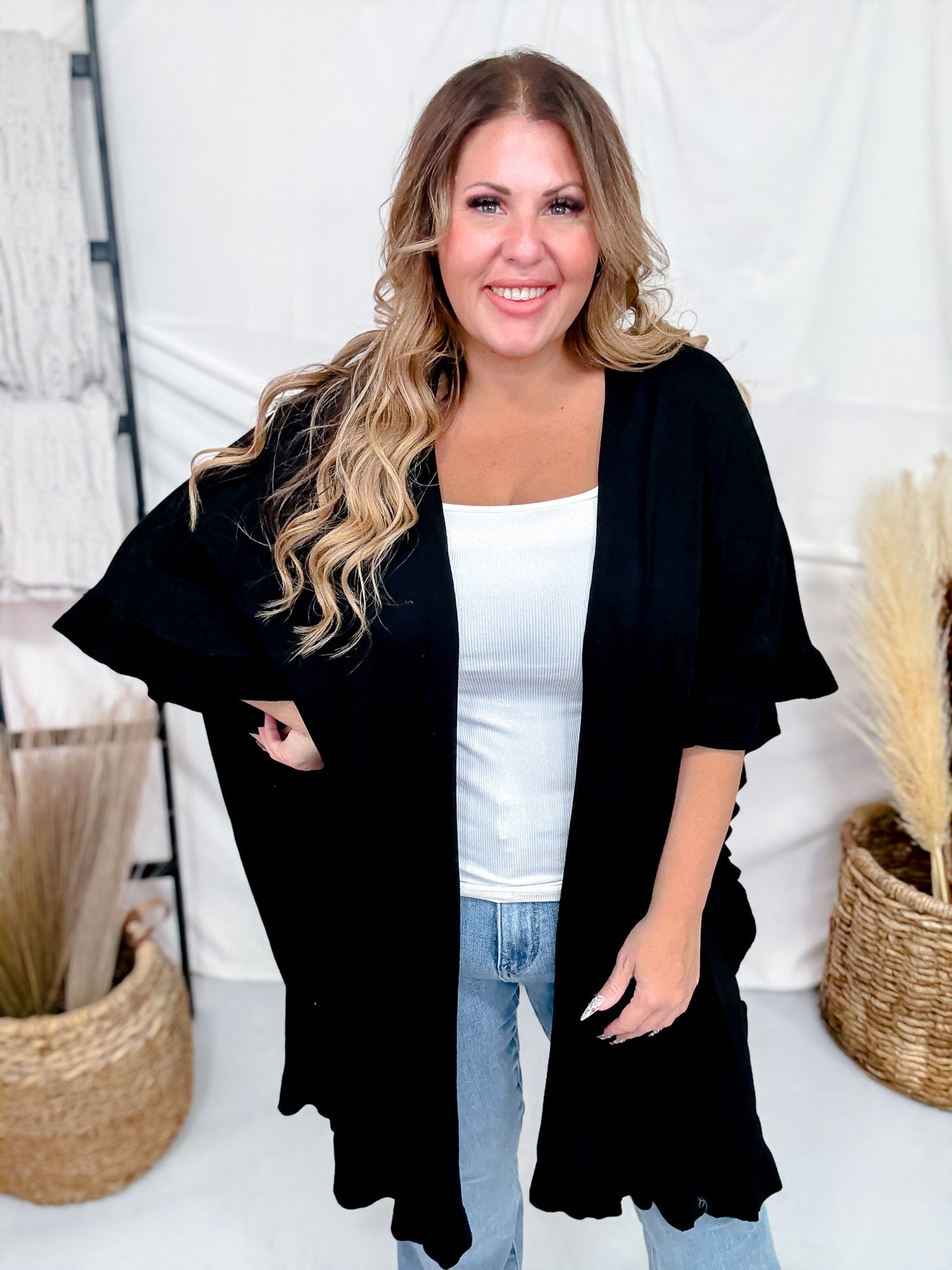 Embrace easygoing style with this black open front cardigan, highlighted by a playful ruffled hem that gives your outfit a flirty edge. Crafted from soft fabric, it flows gently for comfortable layering over tees or dresses. Ideal for casual outings or cozy nights, this cardigan adds a fun, feminine touch to your wardrobe.