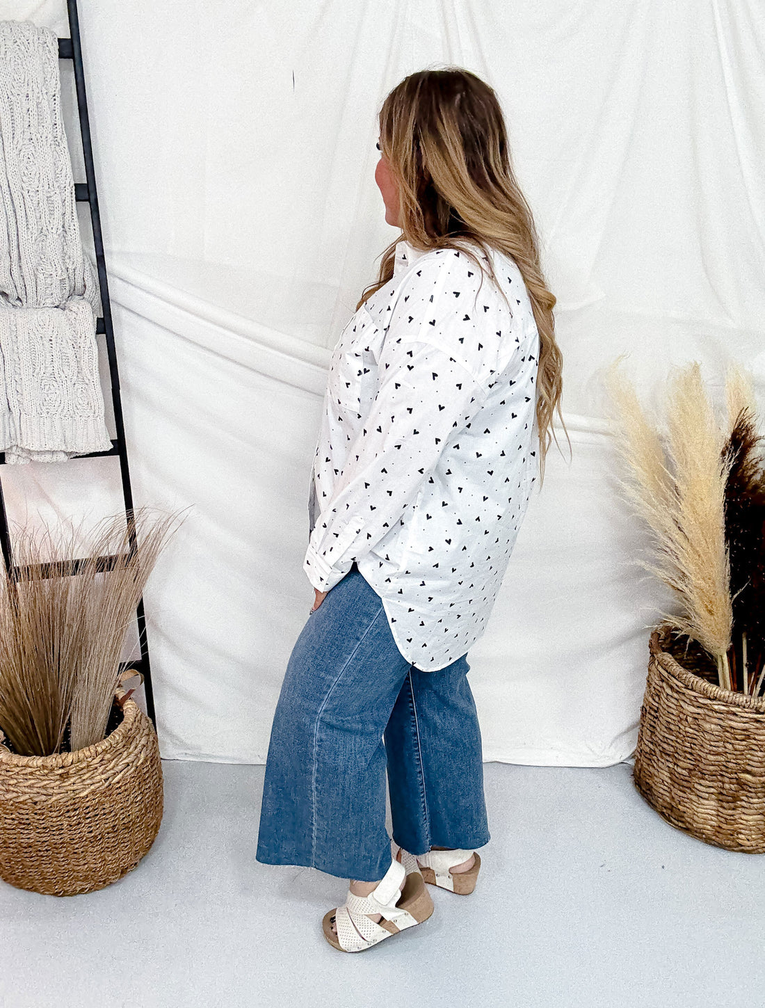 Add a touch of fun to your wardrobe with this long sleeve button-front top. Featuring a crisp white background adorned with black hearts and classic polka dots, it’s perfect for mixing and matching. The button-front design adds a casual yet stylish vibe, making it an easy choice for day-to-night looks.