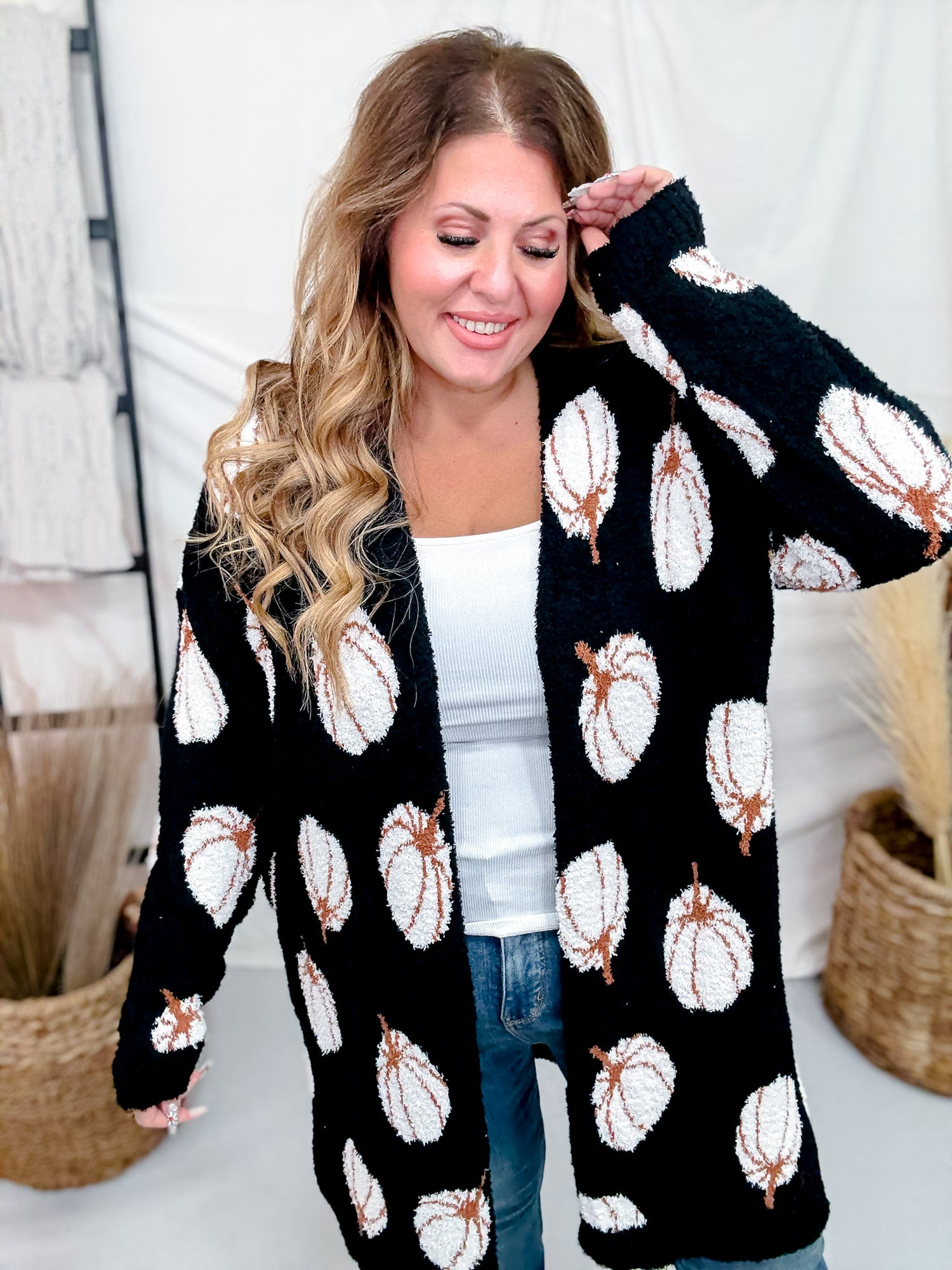 Embrace the cozy charm of fall with this Black & White Pumpkin Print Cardigan! Designed for ultimate comfort, its long sleeves keep you warm while the playful pumpkin print adds a festive touch to any outfit. Perfect for layering on crisp autumn days or spicing up your casual look, this ultra-cozy cardigan invites fun and warmth all season long.