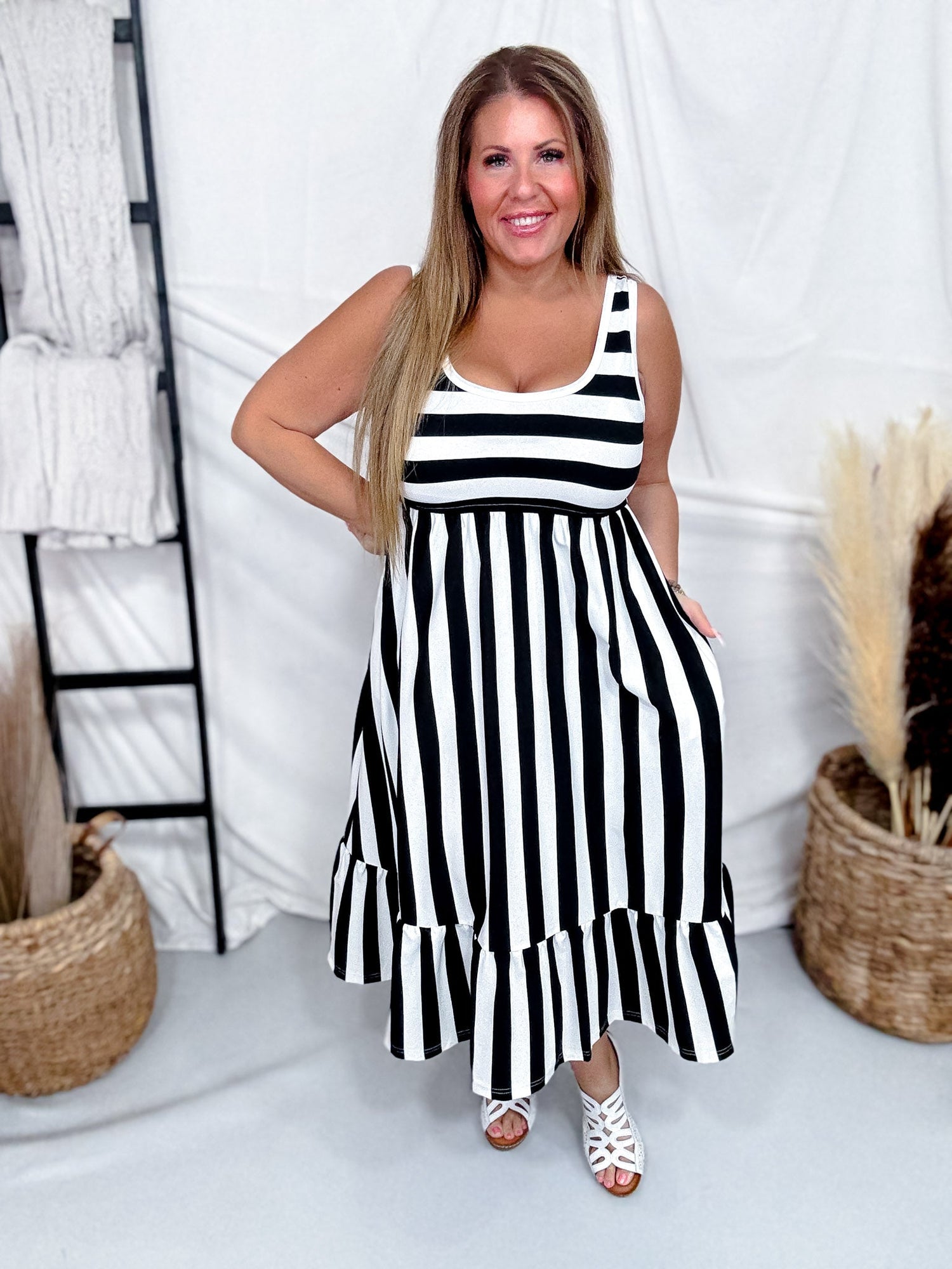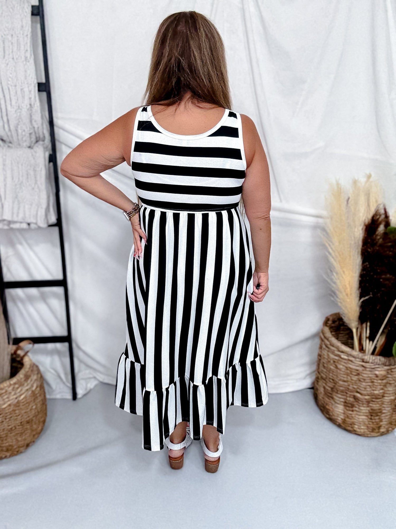 Meet your new go-to dress! This dress features a classic black and white striped pattern that never goes out of style. The tiered silhouette adds a flirty touch while the sleeveless, round-neck design keeps things breezy and comfortable. Dress it up or down—this versatile piece is ready for whatever adventure comes your way.