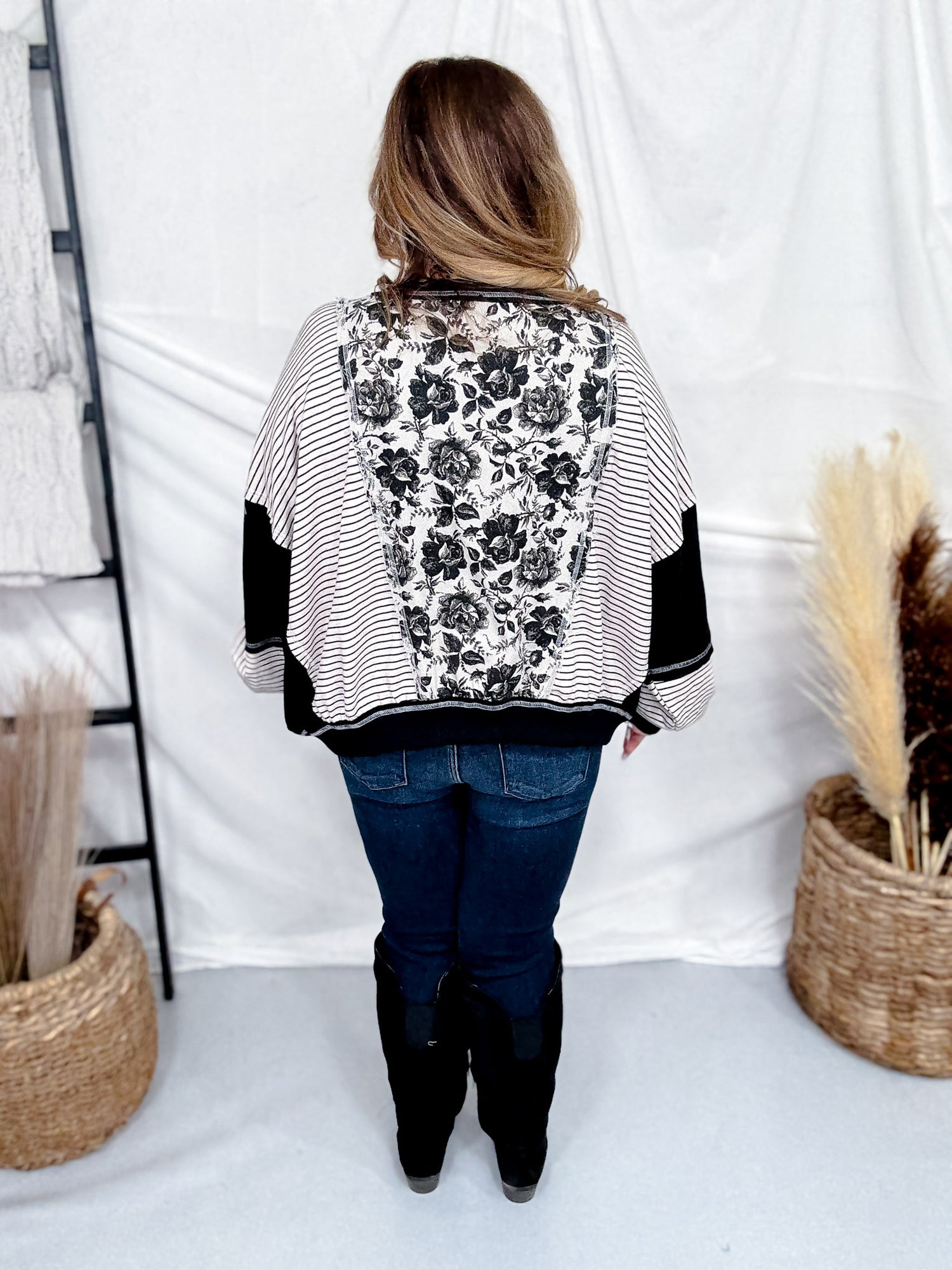 Bring a fresh twist to your wardrobe with this black and white striped top, featuring a charming rose twill print. Long sleeves and contrasting solid black hems add stylish flair and a polished finish. Perfect for mixing and matching, this top balances bold patterns with classic details for an effortlessly fun look.