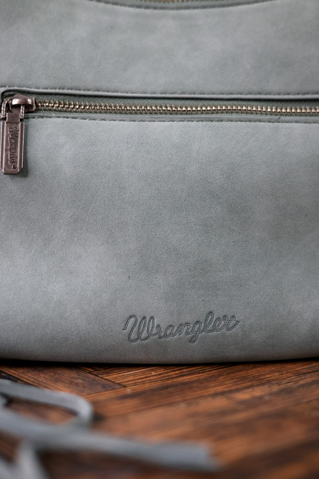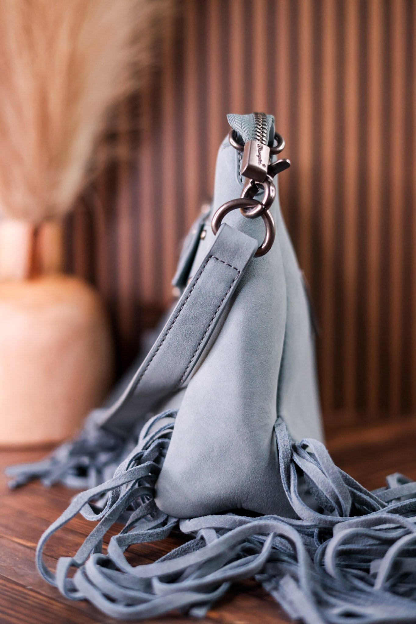This light blue faux leather purse is a playful twist on western style, featuring fringe accents that add lively movement to your look. The iconic Wrangler belt buckle design brings a bold, rustic charm that’s perfect for showing off your adventurous spirit. Compact and fun, it’s a great accessory to brighten any outfit with a splash of color and personality.
