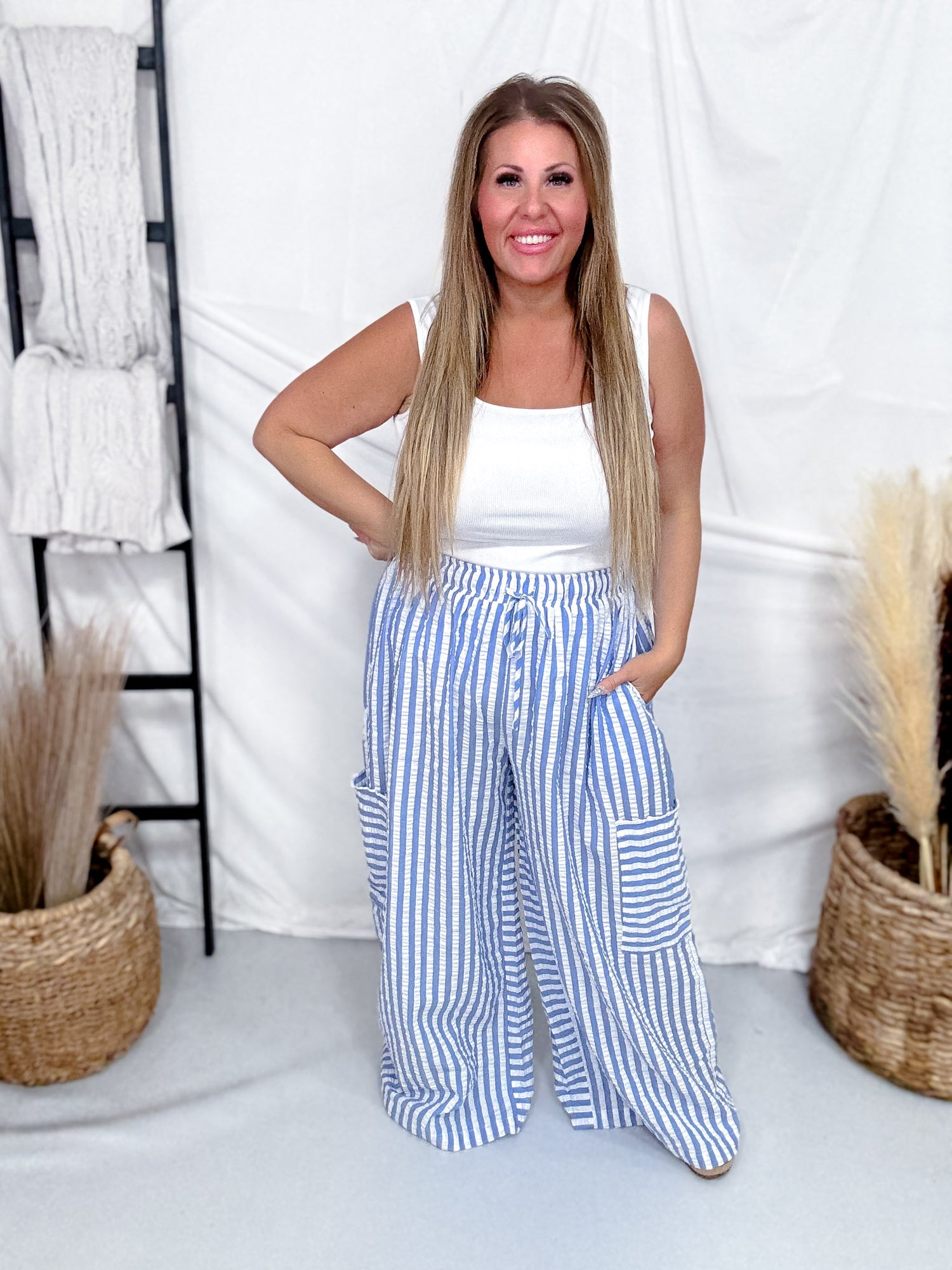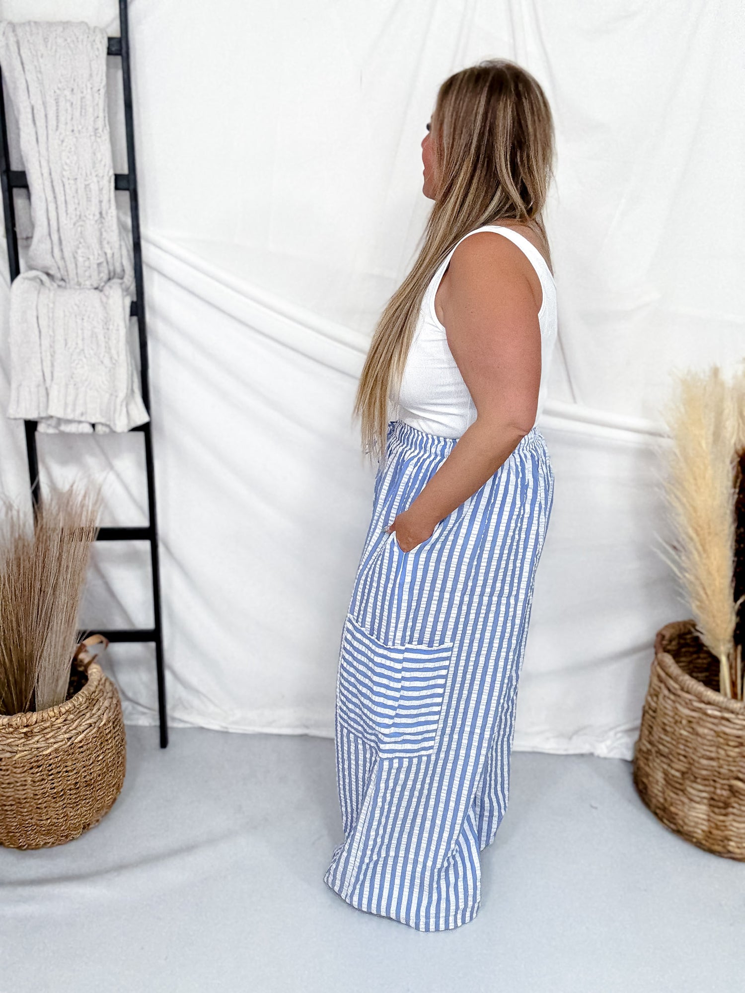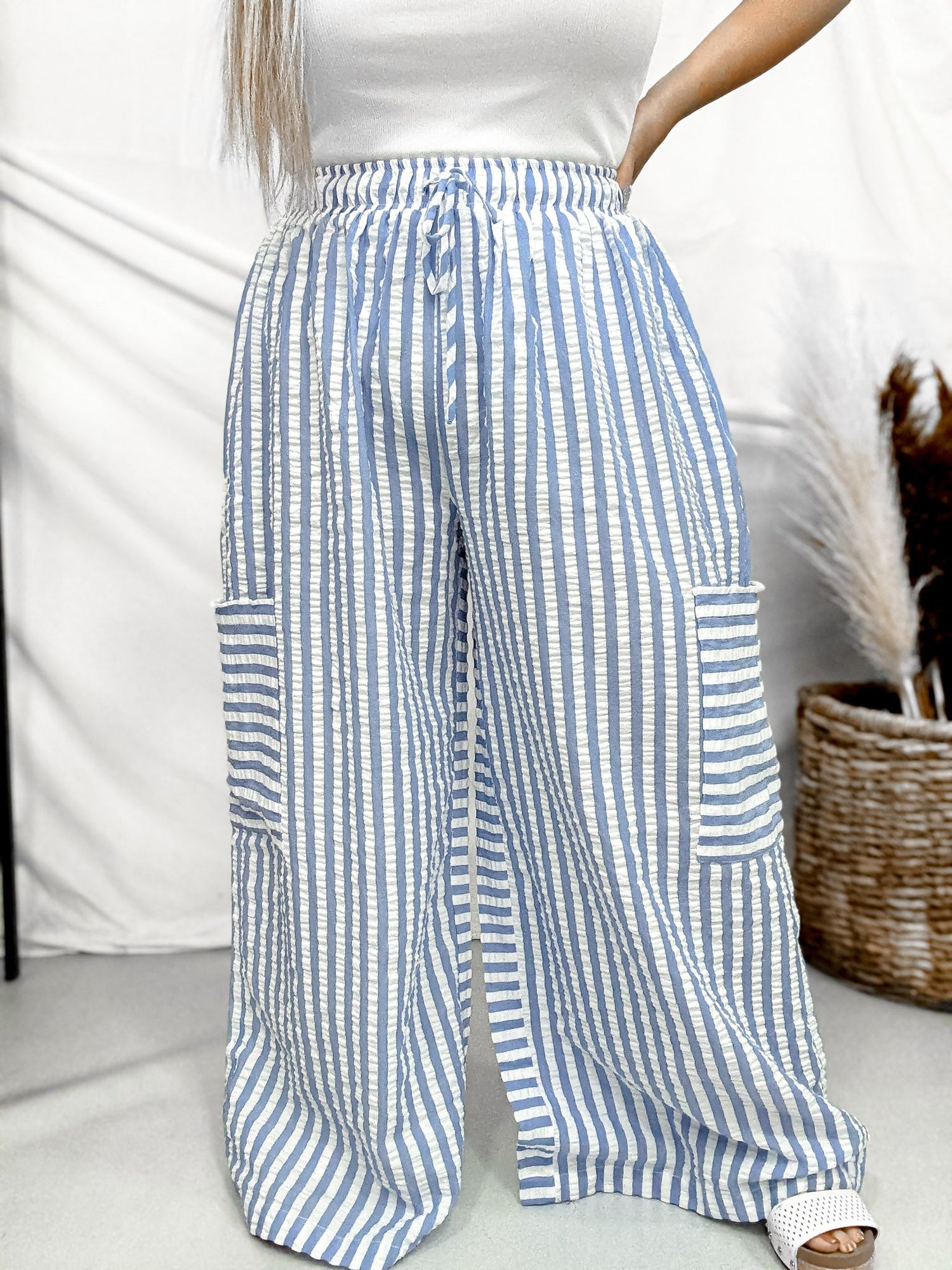 Kick back in style with these striped lounge pants that deliver comfort without sacrificing looks. The wide leg silhouette pairs perfectly with bold vertical blue and white stripes, while oversized patch pockets give you plenty of room for your essentials—or just your hands. Perfect for lazy days at home or running errands in cozy confidence.