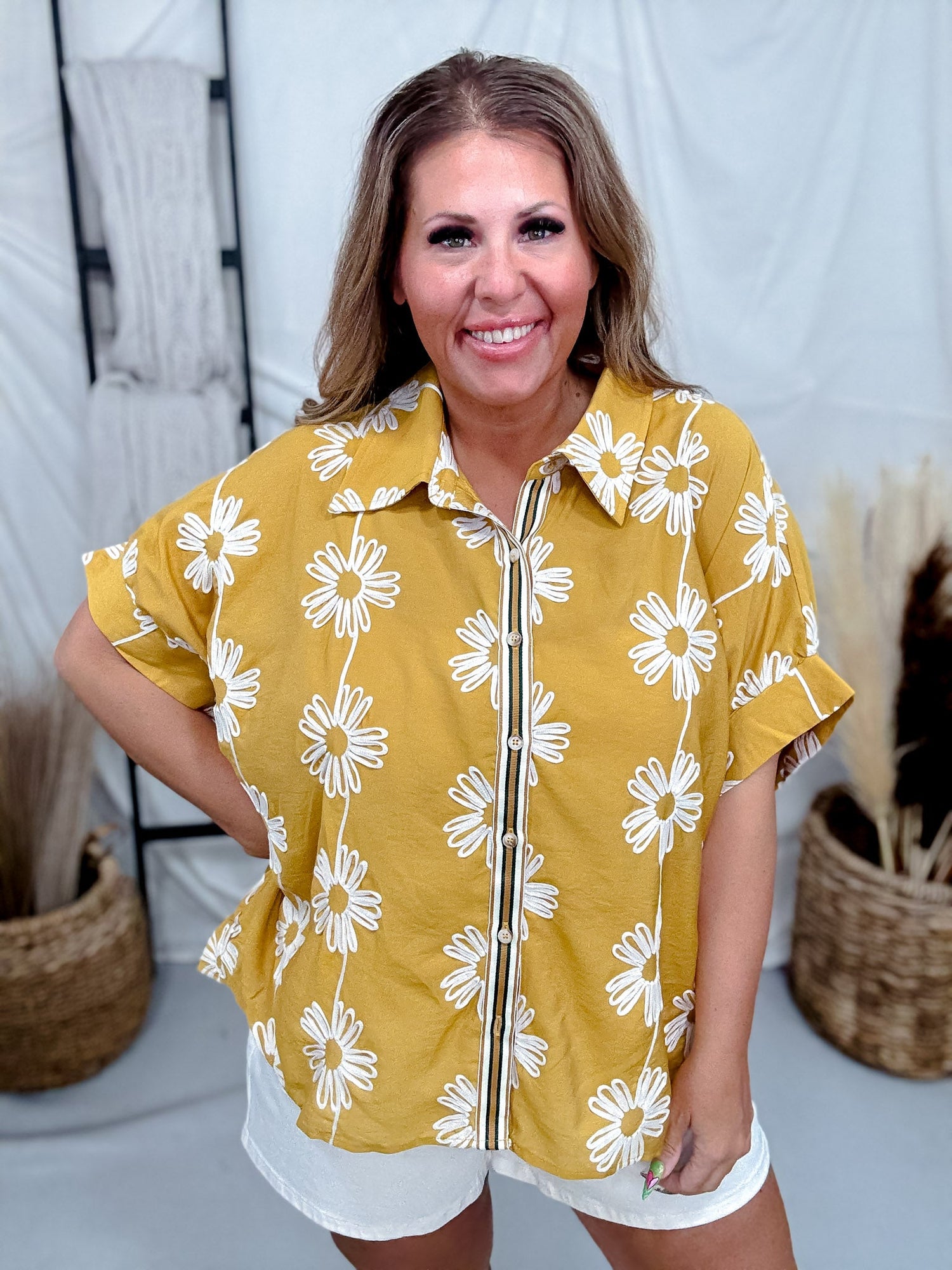 Sunshine meets nostalgia in this breezy marigold button-down. White embroidered blooms sprinkle across the top while accent stripes trace the button placket, giving major retro-cool energy. Slip it on for instant vintage vibes that feel fresh and fun.