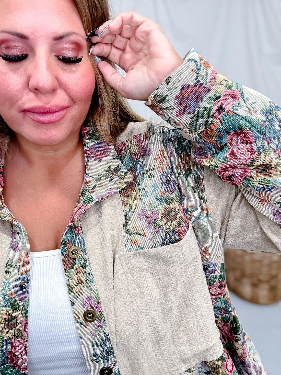 This taupe peplum top is a playful mix of vintage charm and modern style. Featuring floral tapestry patchwork panels and long sleeves, the button-down design flatters with its structured waist ruffle. Dress it up or down—it's the perfect statement piece for anyone who loves bold, eclectic fashion.