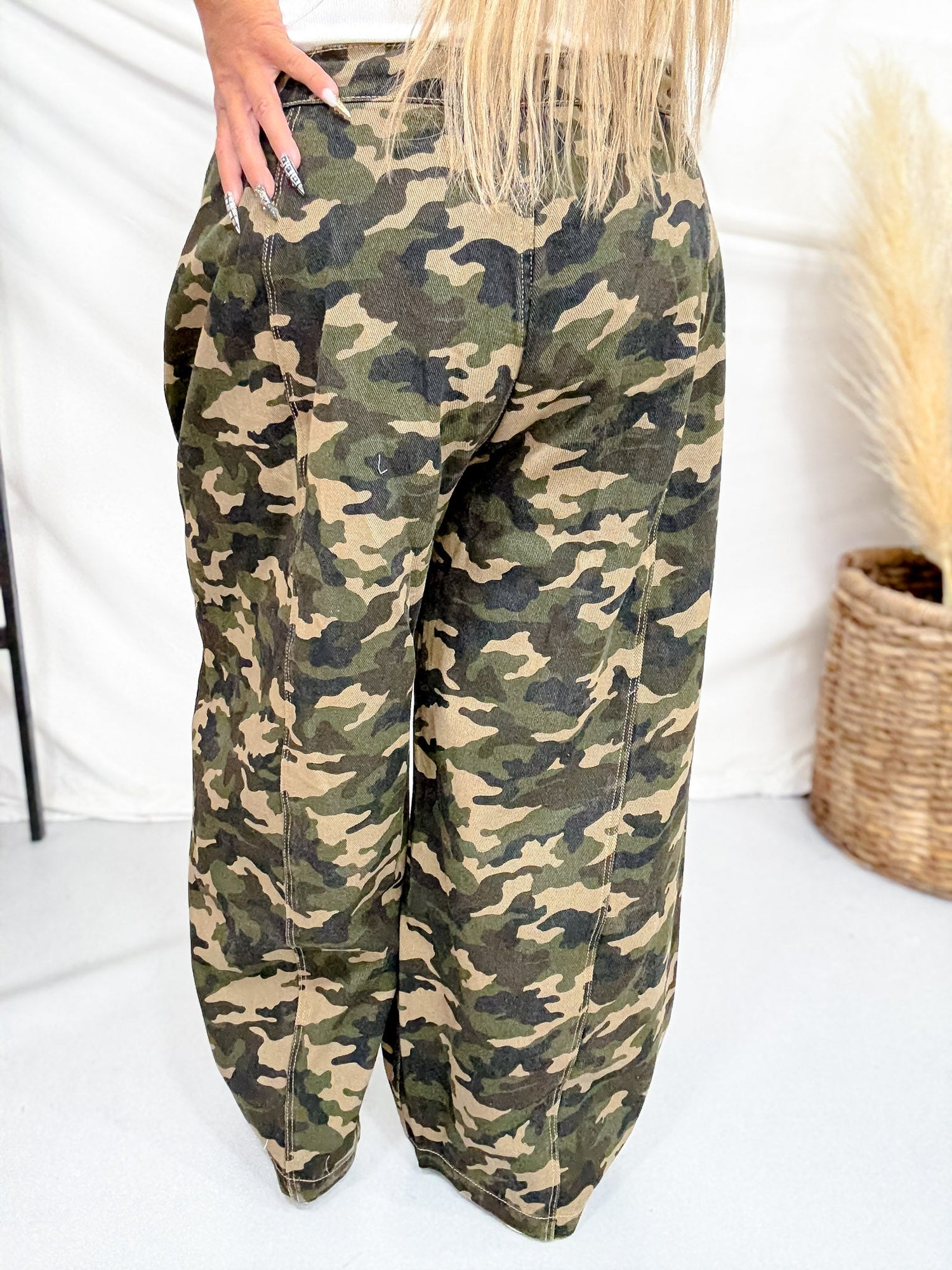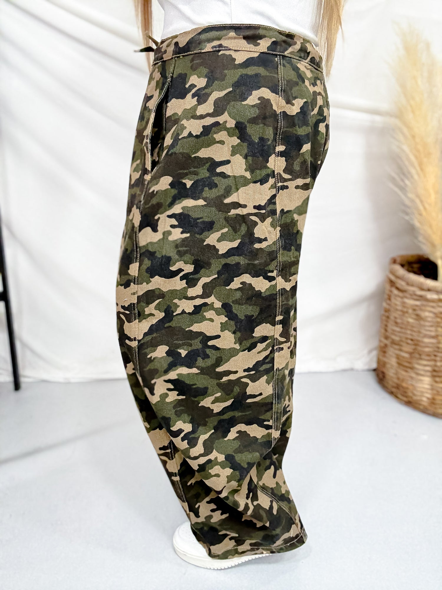 Step into effortless cool with these camo print cropped pants. The high waist and relaxed fit create a laid-back silhouette that works whether you're running errands or grabbing coffee with friends. The drawstring waist keeps the fit adjustable, while the cropped length hits just right for sneakers or slides.