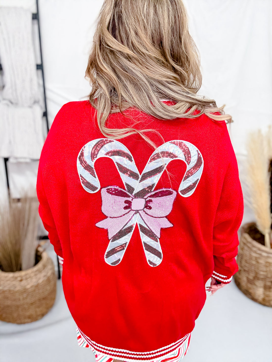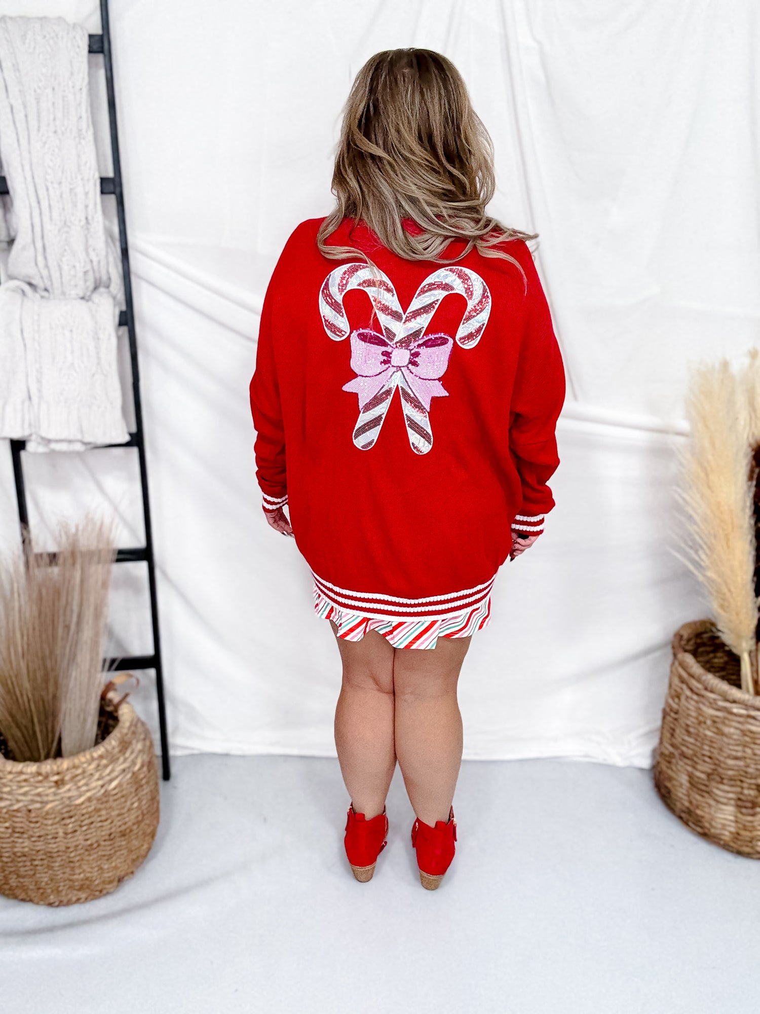 Step into the holiday spirit with the Candy Cane Relaxed Cardigan. Showcasing a striking candy cane design on the back and a lively red shade all over, this cardigan blends classic charm with festive fun—just right for spreading cheer this Christmas!