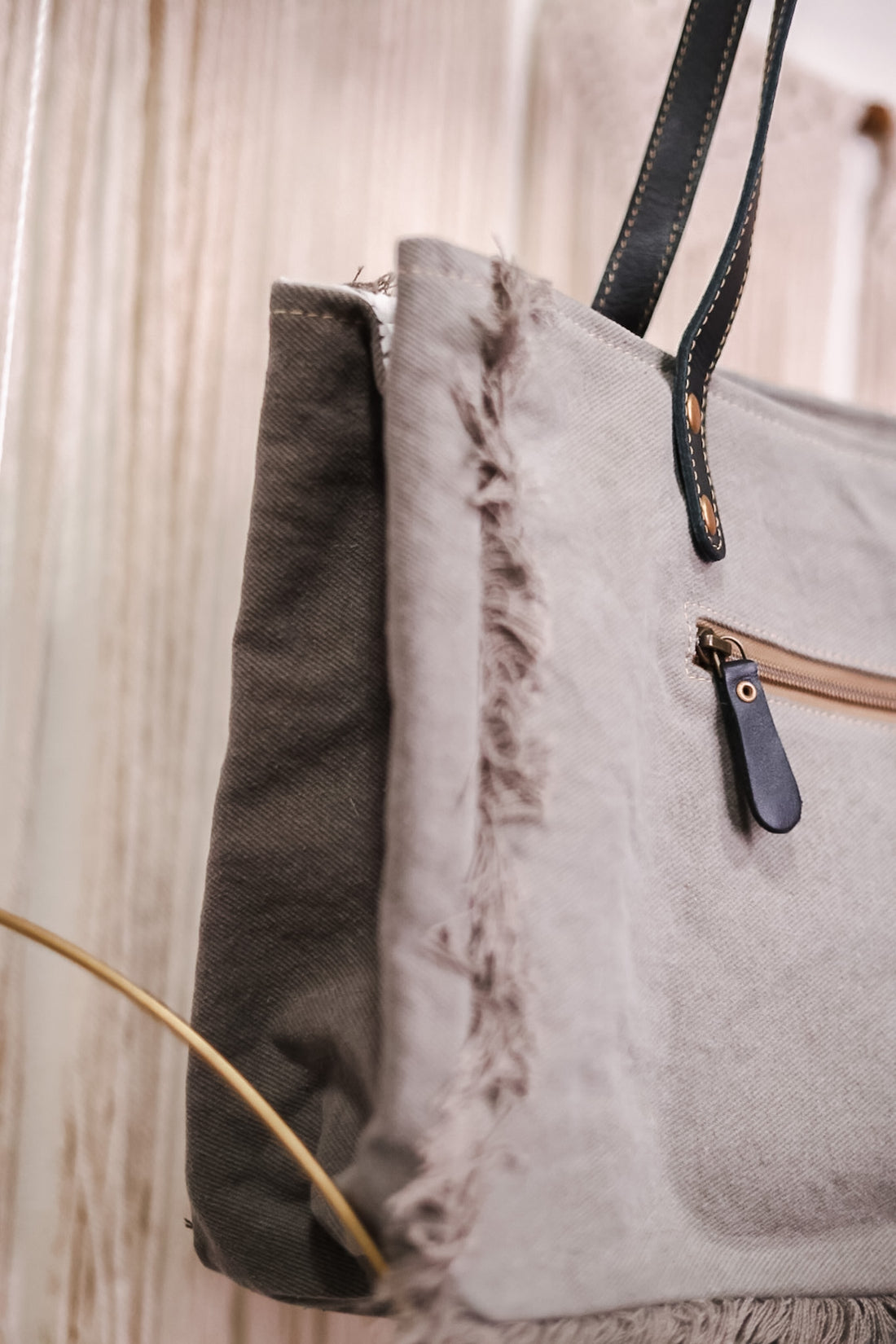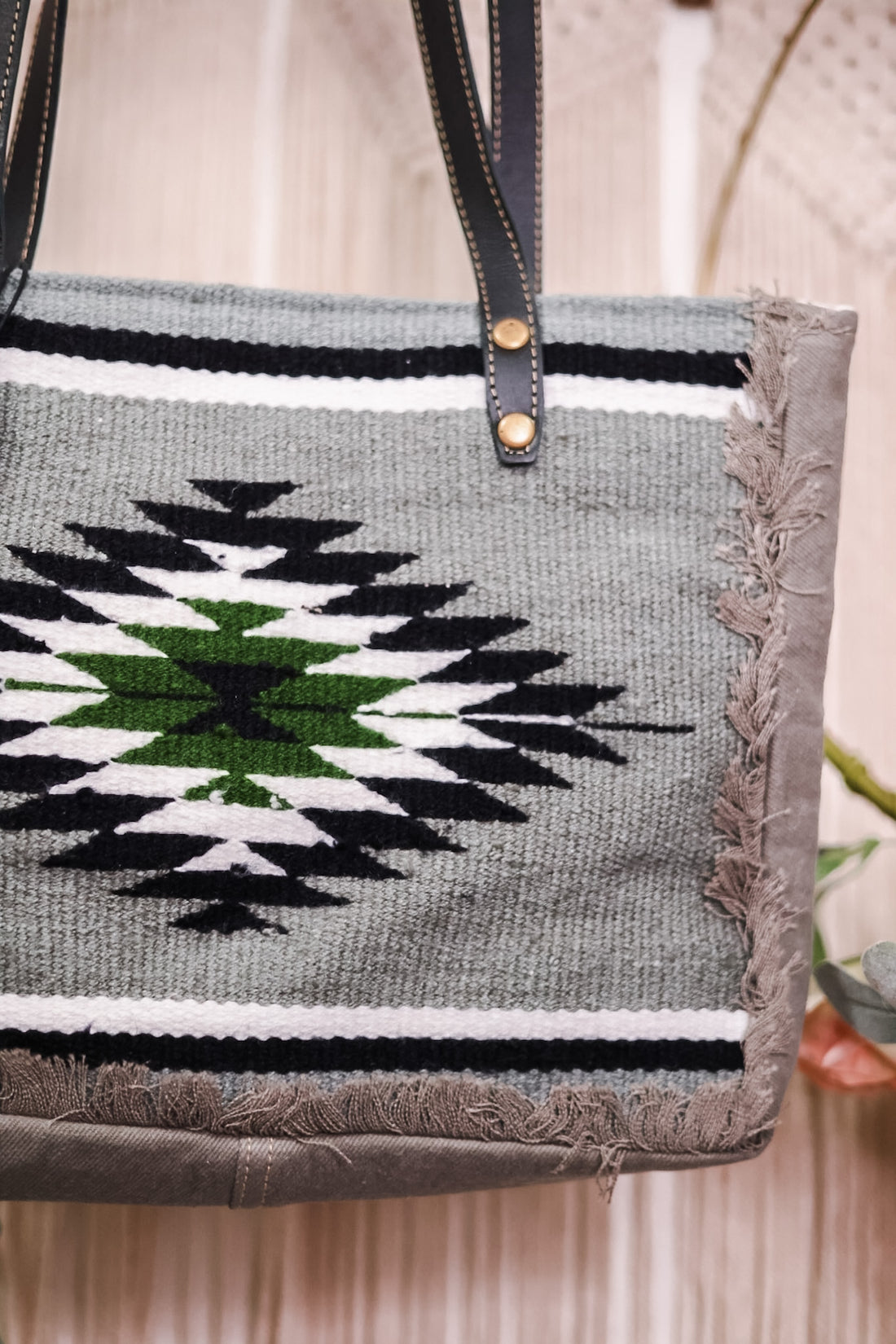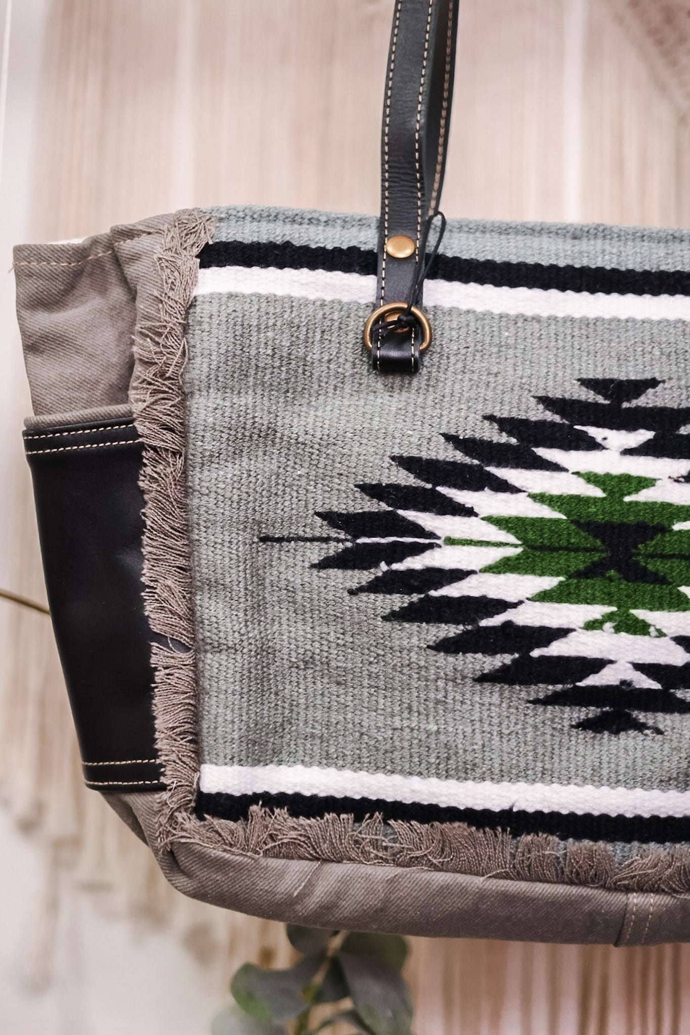 Experience the perfect blend of style with this bag! It boasts classic color combinations and ample space for all your essentials. The charcoal grey panels and intricate upcycled rug design complement each other perfectly. Additional slip pockets in sleek ebony leather and thoughtful details such as frayed edges and a sturdy leather strap make this tote a must-have.