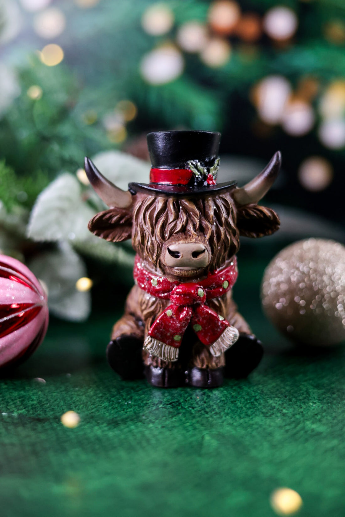 Bring festive cheer to your home with these delightful Christmas Highland Cow tabletop resin decorations. Featuring three charming styles, each cow is crafted with intricate details that capture their fluffy coats and friendly faces. Perfect for adding a playful, rustic touch to your holiday decor, these sturdy resin figures brighten mantels, shelves, or tables.