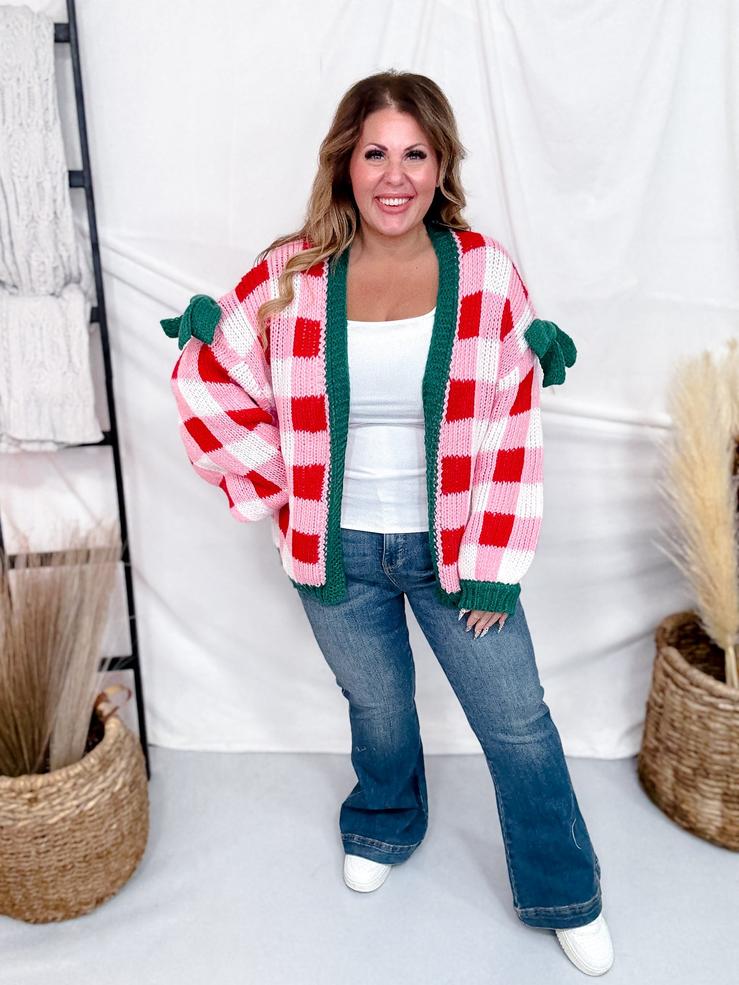 Get ready to spread holiday cheer in this charming Christmas-themed open sweater cardigan! Featuring playful ribbon details on the sleeves, it adds a festive touch to your cozy winter look. Perfect for layering over your favorite outfits, this cardigan blends warmth with whimsical style, making every holiday gathering a little more magical.