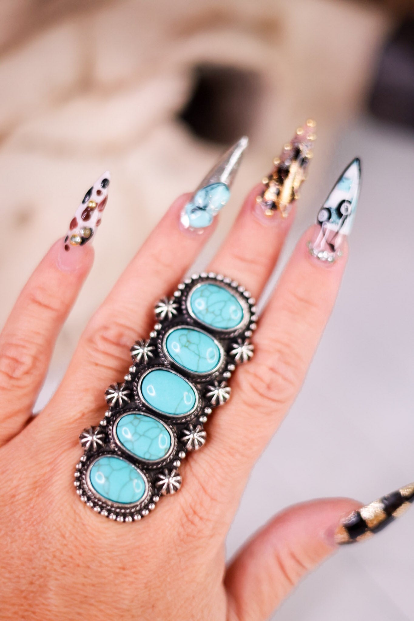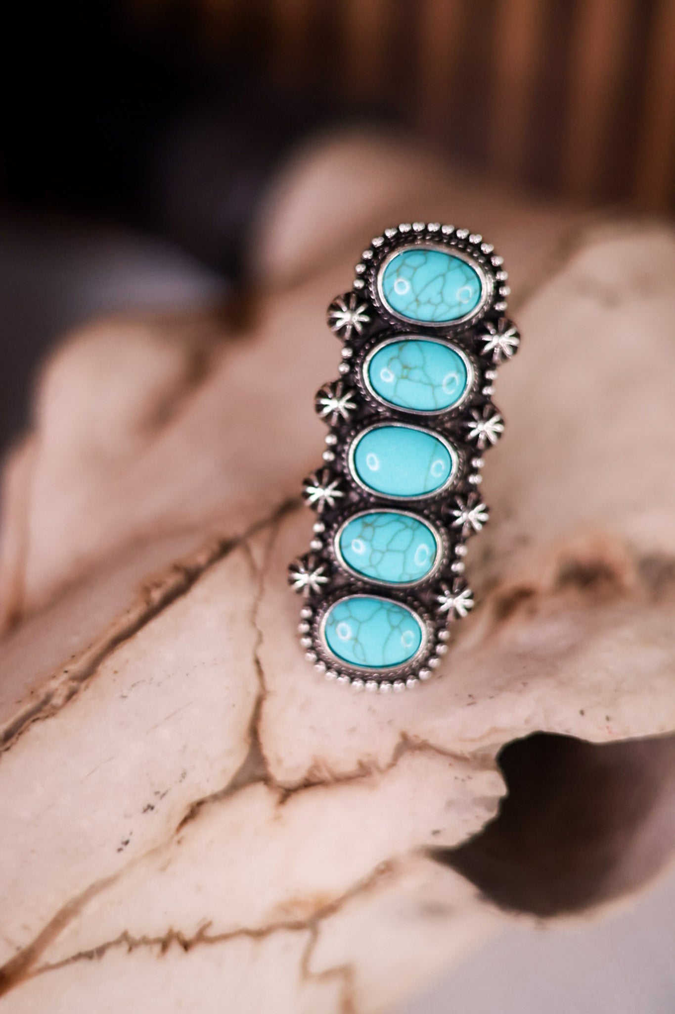 This Chunky Western Turquoise Concho Cuff Ring brings a splash of desert charm to your style! Featuring five vibrant turquoise stones lined up in a row, framed by shiny silver conchos for that perfect western flair. The adjustable cuff design means it fits just right, ready to add a playful pop of color and personality to any outfit. Saddle up and let your fingers do the talking!