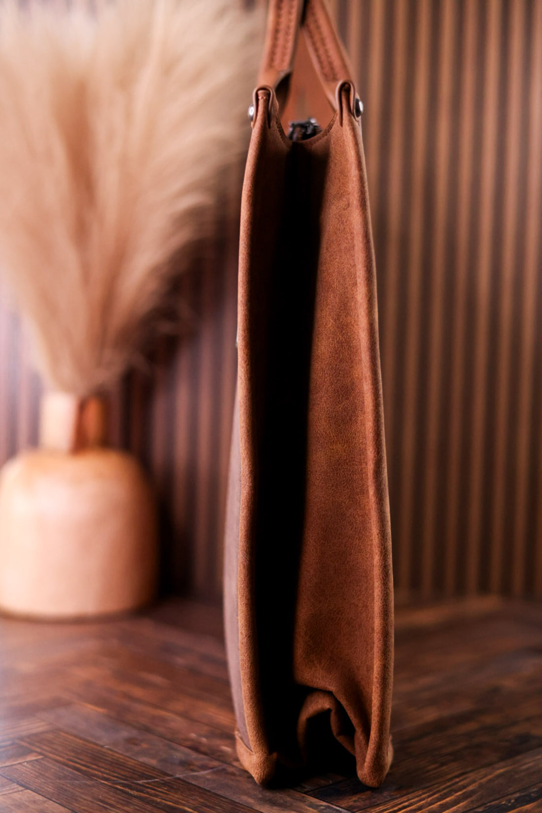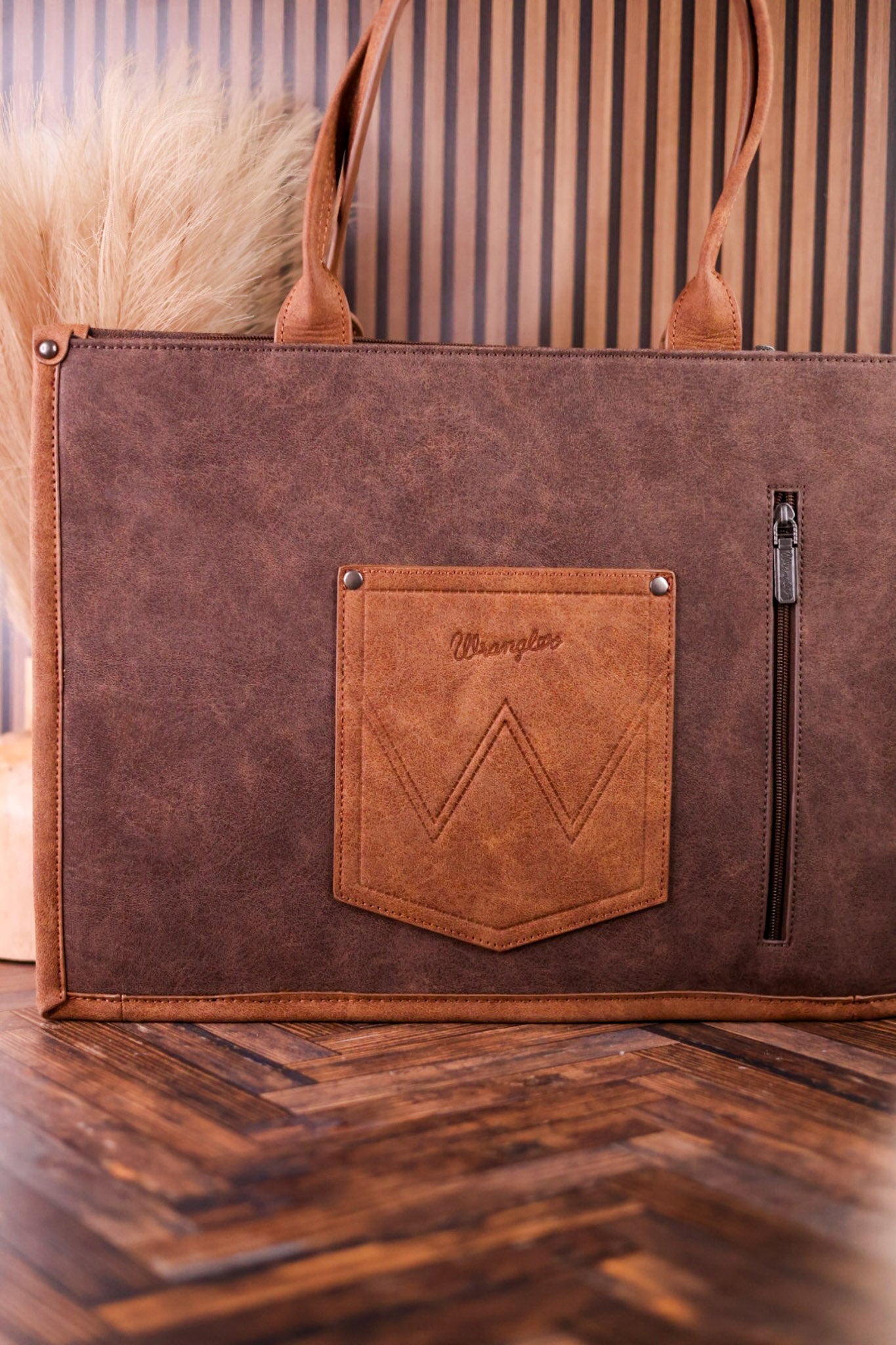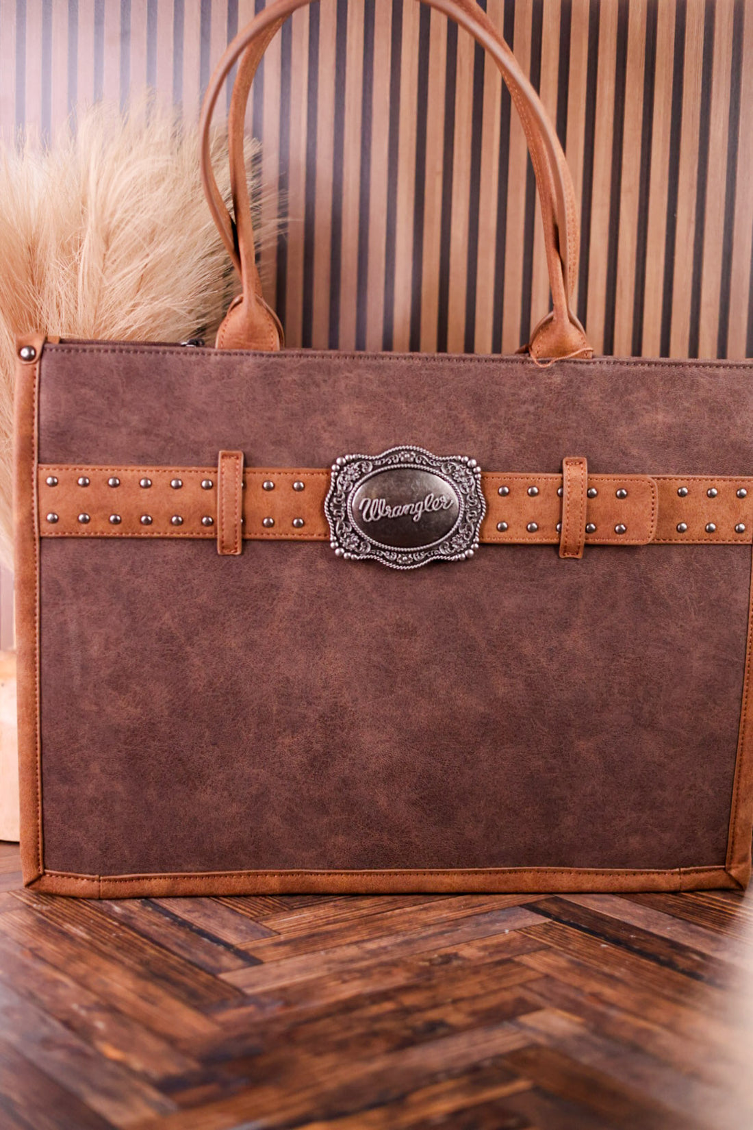 This spacious coffee brown vegan leather tote makes a striking impression with its studded belt accents and an official Wrangler belt buckle front and center. Blending fun Western flair with generous space, it’s ideal for holding all your essentials while adding a dash of rugged style to your look.