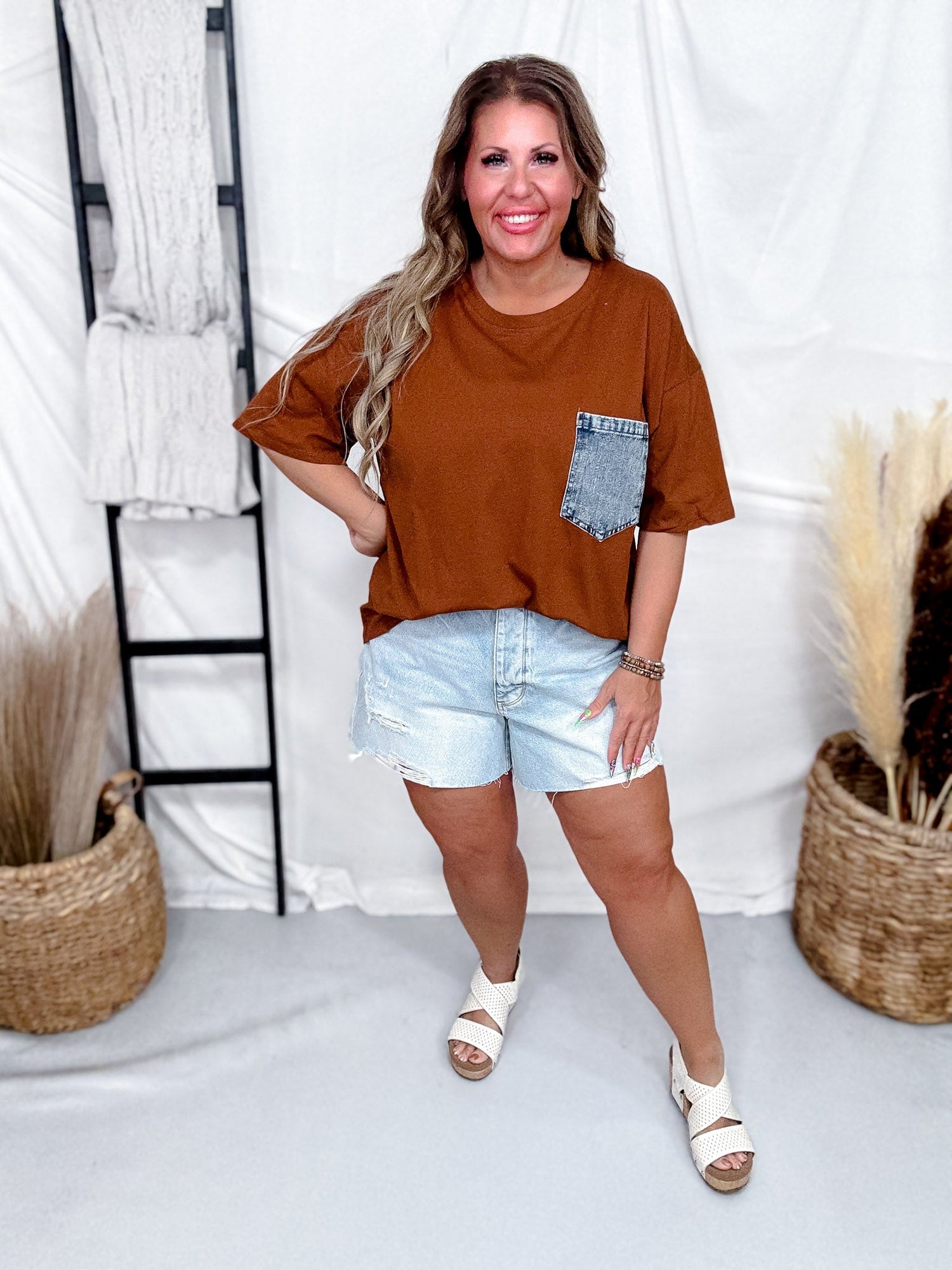 This casual solid brown top features a relaxed, oversized fit with dropped shoulders, perfect for an effortlessly laid-back look. The standout detail is a contrasting denim pocket, adding a unique and stylish touch to the design. Made from soft, breathable fabric, this top pairs beautifully with shorts or jeans for everyday comfort and style.