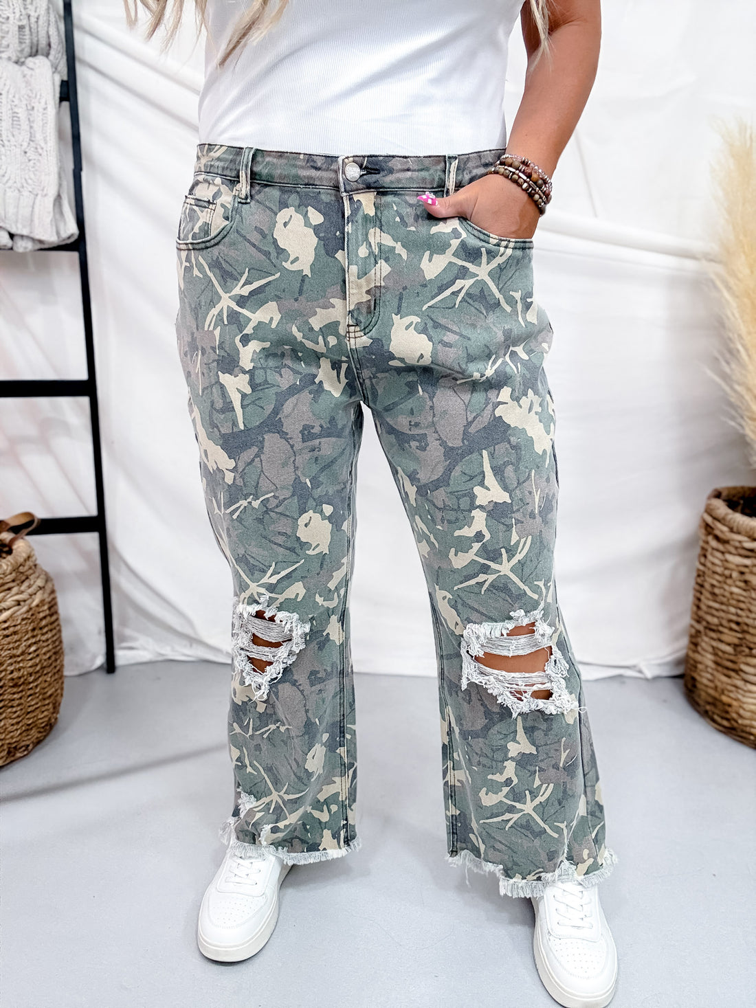These camouflage cropped jeans blend rugged style with contemporary edge. Distressed hems and strategic knee rips create an intentionally worn-in aesthetic that works for casual wear or streetwear looks. These pants are versatile and will bring a touch of attitude to any outfit.Ā