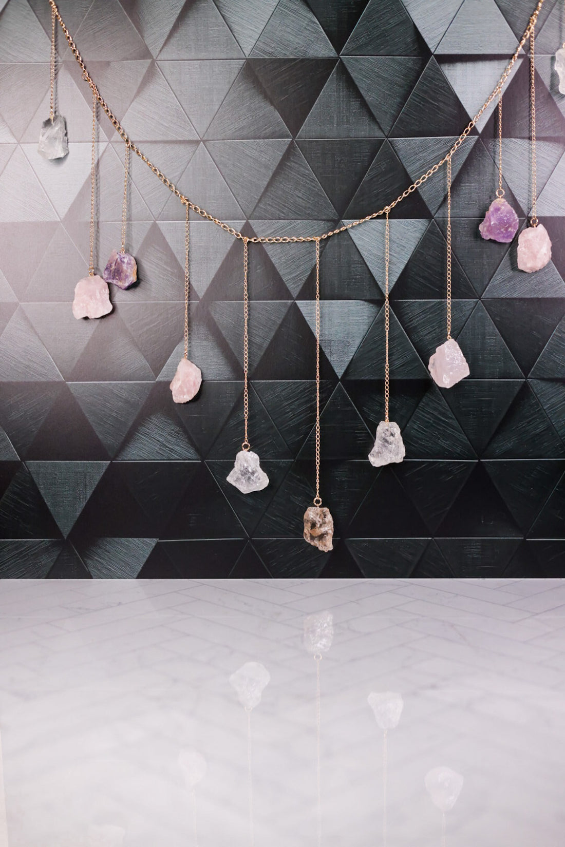 The Crystalline Wall Banner brings a new, bold design to our wall hanging collection! Complete with 11 rough crystals β rose quartz, smoky quartz, clear quartz, and amethyst β this makes a bold and beautiful addition to your home dΓ©cor offerings. This combination of crystals was curated to enhance feelings of calm, clarity, love, and healing. Product features: β 4 rough 1β β 2β clear quartz pieces β 4 rough 1β β 2β rose quartz pieces β 2 rough 1β β 2β amethyst pieces β 1 rough 1β β 2β smoky quartz piece β sleek gold metal chain β 2 gold rings for mounting Dimensions: 25β L x 25β W