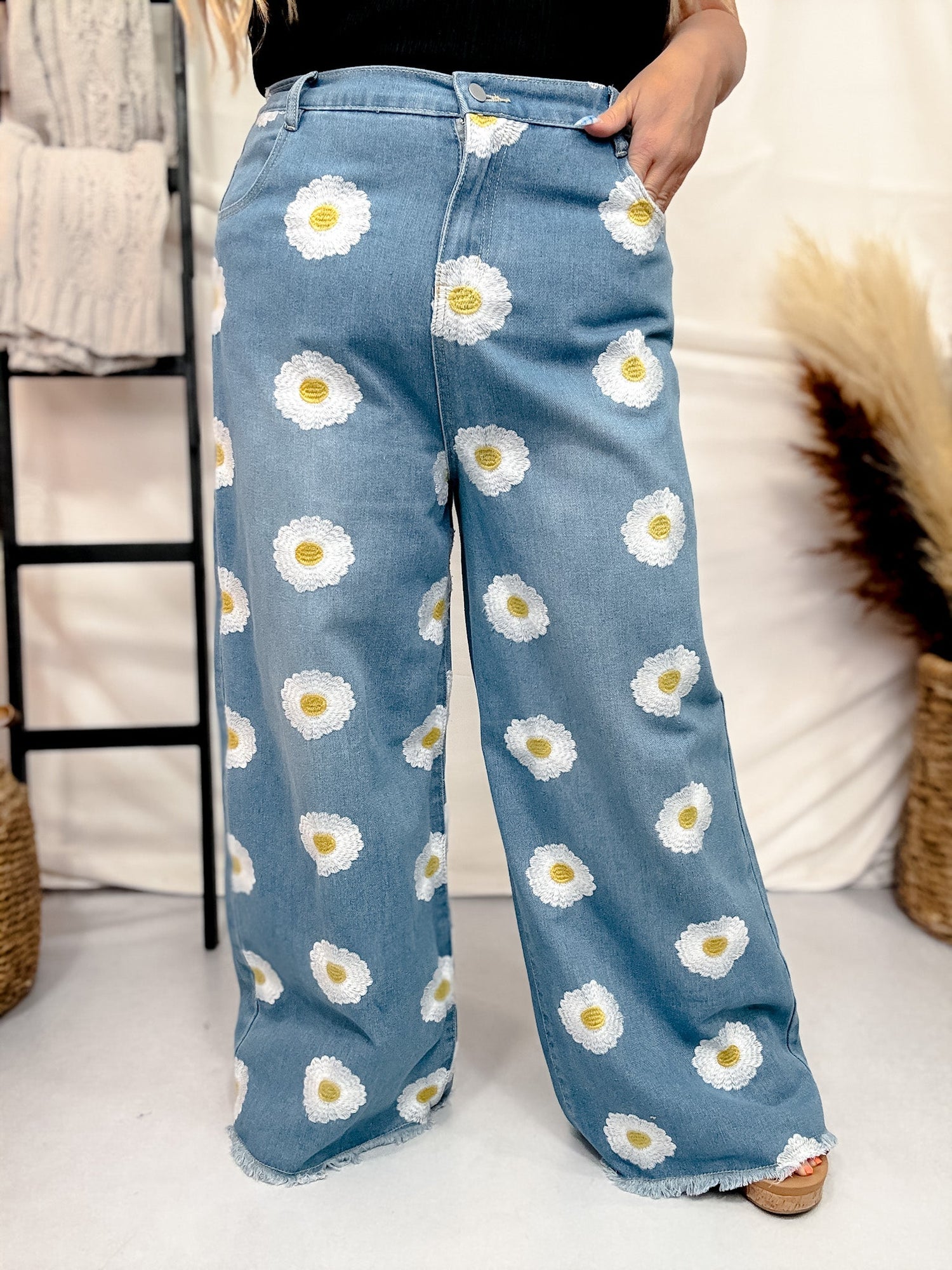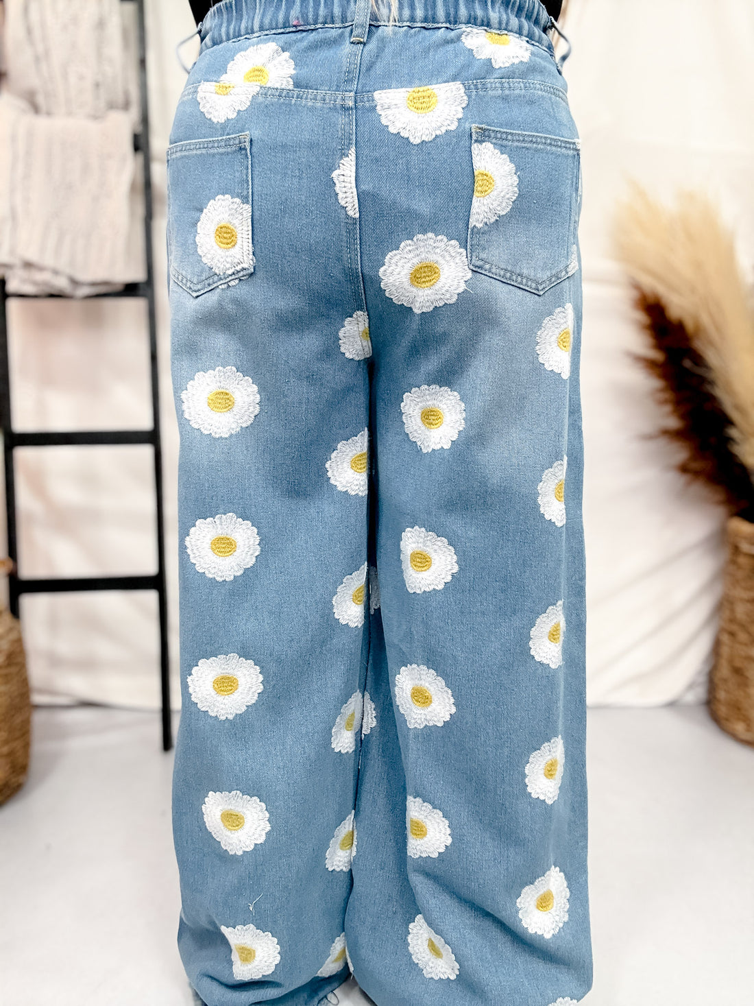These vintage-inspired denim pants are all about playful charm, featuring cheerful white and yellow daisy embroidery scattered across a classic light wash. Designed with a flattering high-rise waist and relaxed wide-leg fit, they offer comfort and style in equal measure. The raw-edge hem adds a casual, lived-in touch perfect for weekend adventures or creative styling.