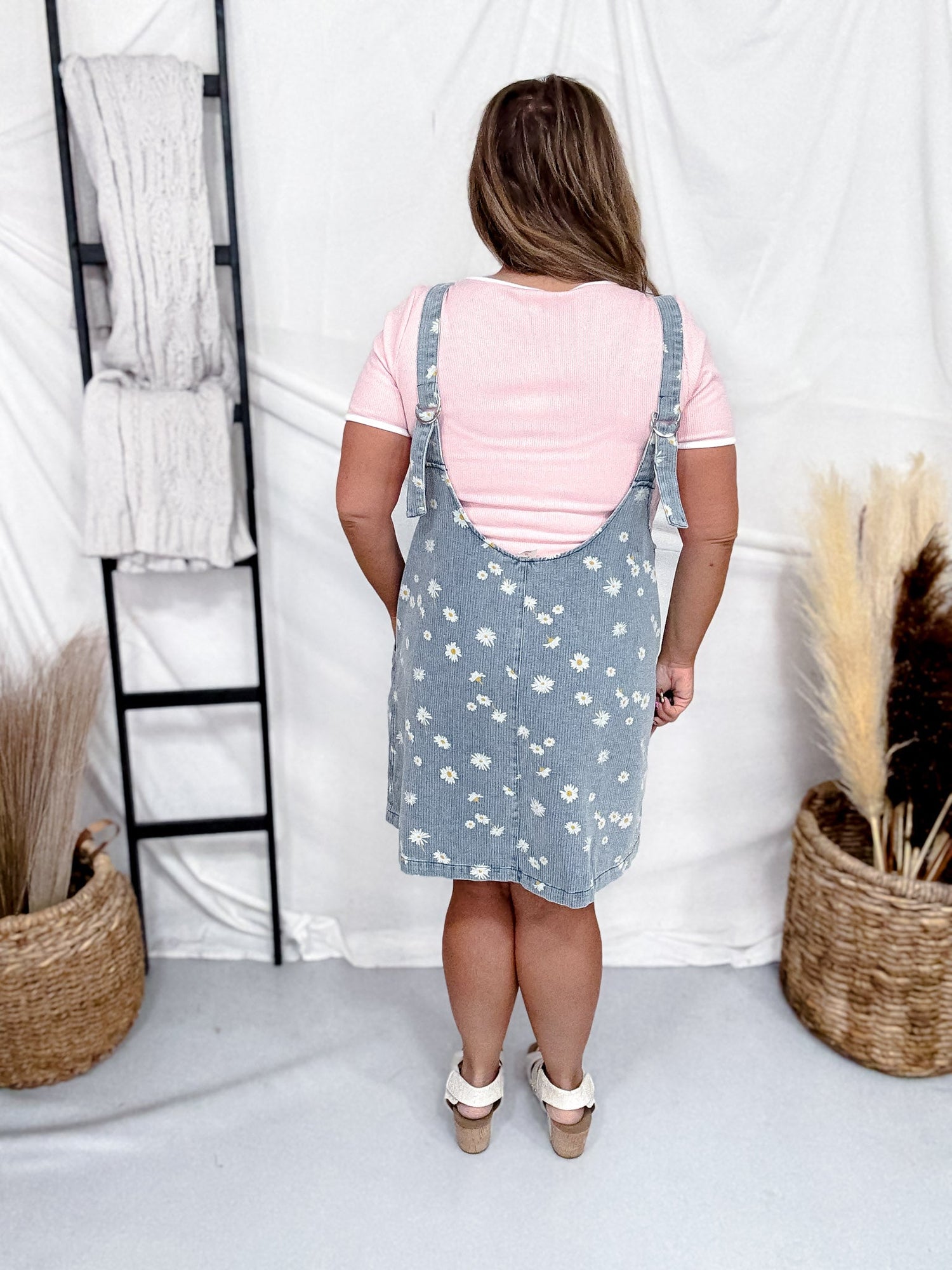 Meet your new go-to: a denim overall dress that's all smiles with its cheerful daisy print. The V-neck and generous pockets make it a breeze to wear, while the relaxed fit keeps comfort at the top of the list. Layer it over a tee and you've got an outfit that feels like a sunny day, every day.