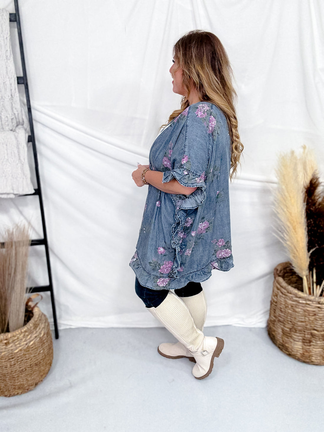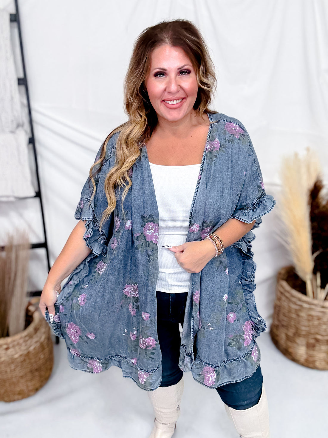 This is a new color way of our best selling Washed Denim Open Ruffle Kimono.