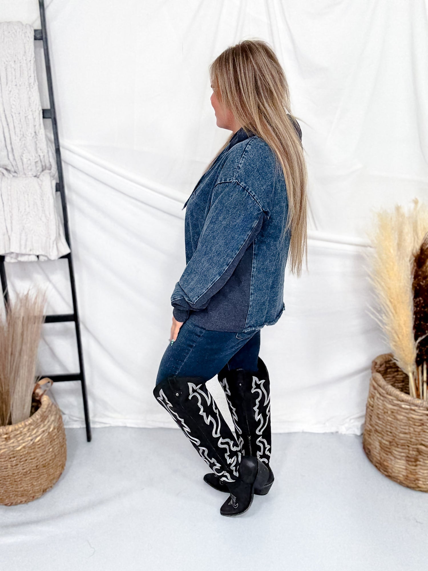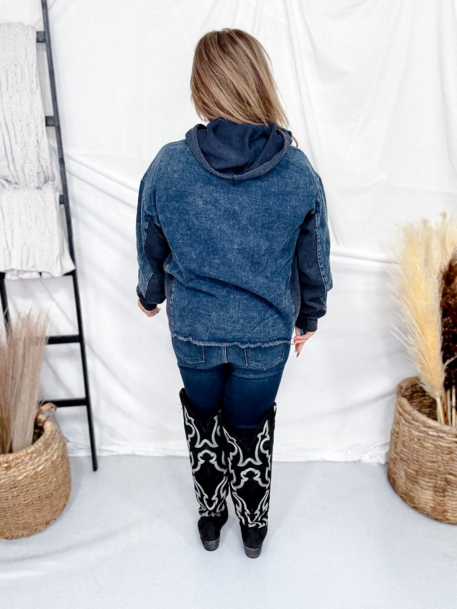 Saddle up in style with this Dark Wash Urban Denim Hoodie—where rugged meets refined. Crafted from dark wash denim with black ribbed fabric accents, this piece features a raw edge hem and a bold embossed cowboy design on the front.