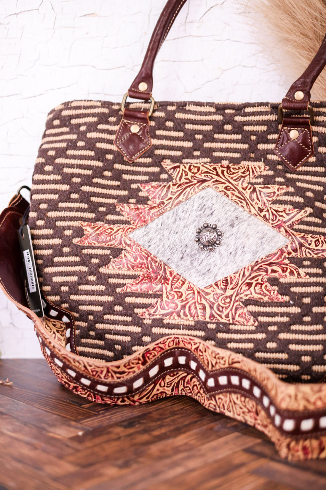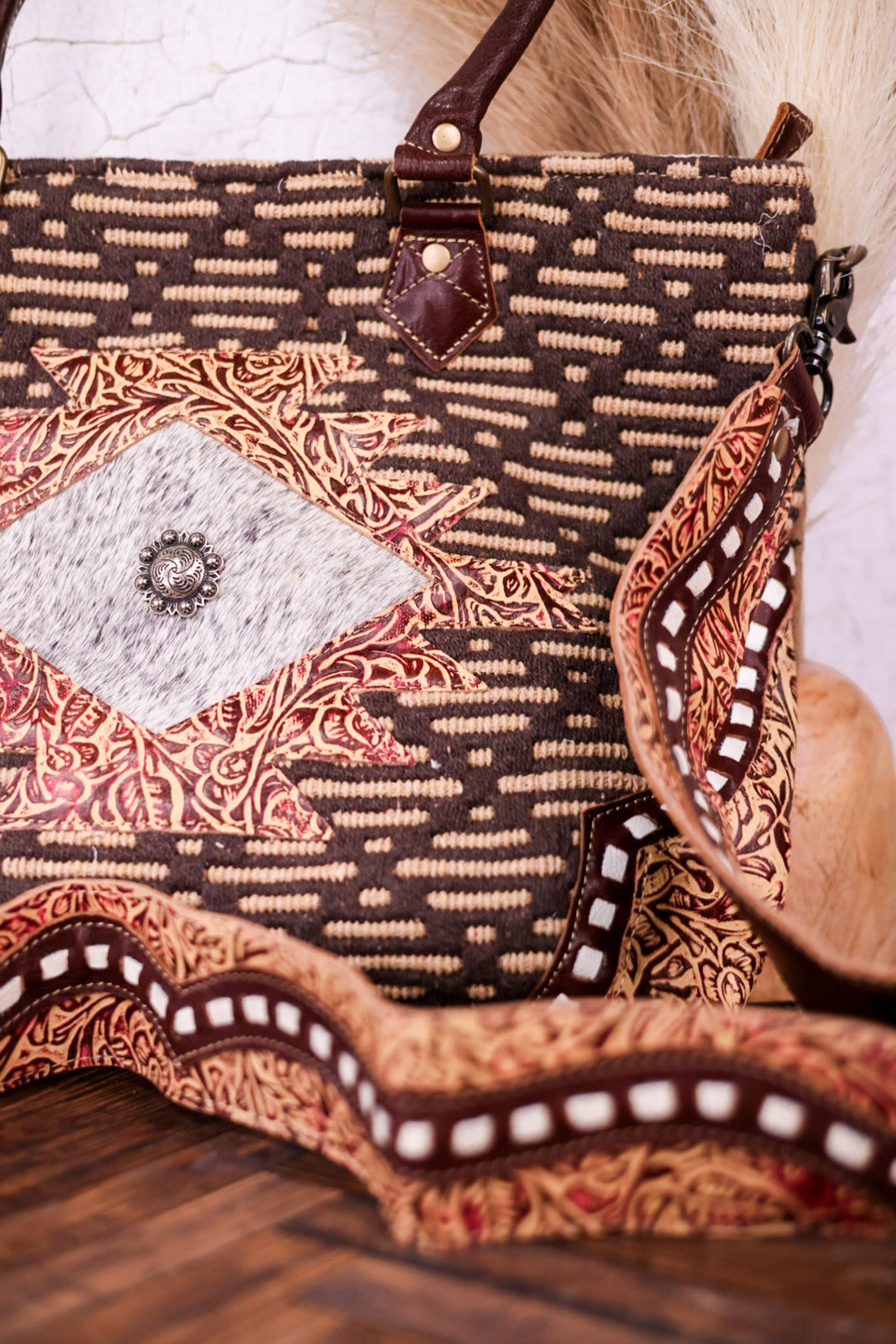 Carry your essentials in style with our Evil Eye Tote Bag. Made of durable canvas and luxurious hair-on leather, this tote bag features elegant embossed floral leather accents and a unique western inspired evil eye design.Brand: Myra