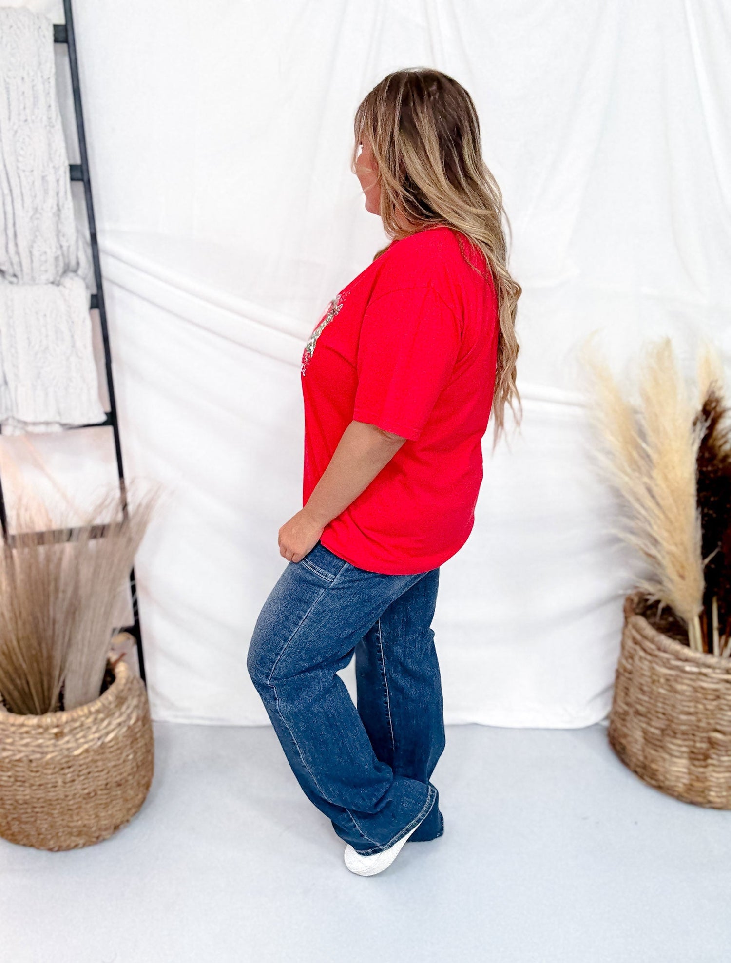 This playful red graphic t-shirt brings holiday cheer with its short sleeves and festive print of Christmas trees adorned in delicate faux pearls. Perfect for adding a fun and stylish touch to your seasonal wardrobe, it’s comfy enough for all your holiday adventures.