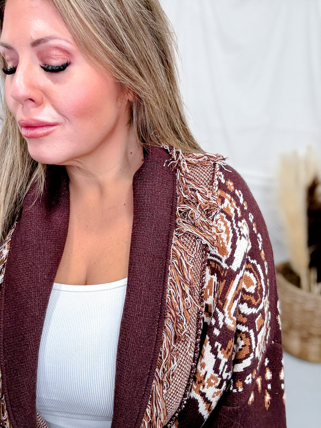 This jacquard knit cardigan is your new go-to for effortless sophistication. Featuring eye-catching woven patterns and playful fringe trim, it's the kind of piece that makes getting dressed fun. The cinched belt defines your silhouette while keeping things relaxed and comfortable, perfect for layering from morning coffee runs to evening hangouts. With its artisanal charm and versatile vibe, it's the elevated casual essential that actually feels as good as it looks.