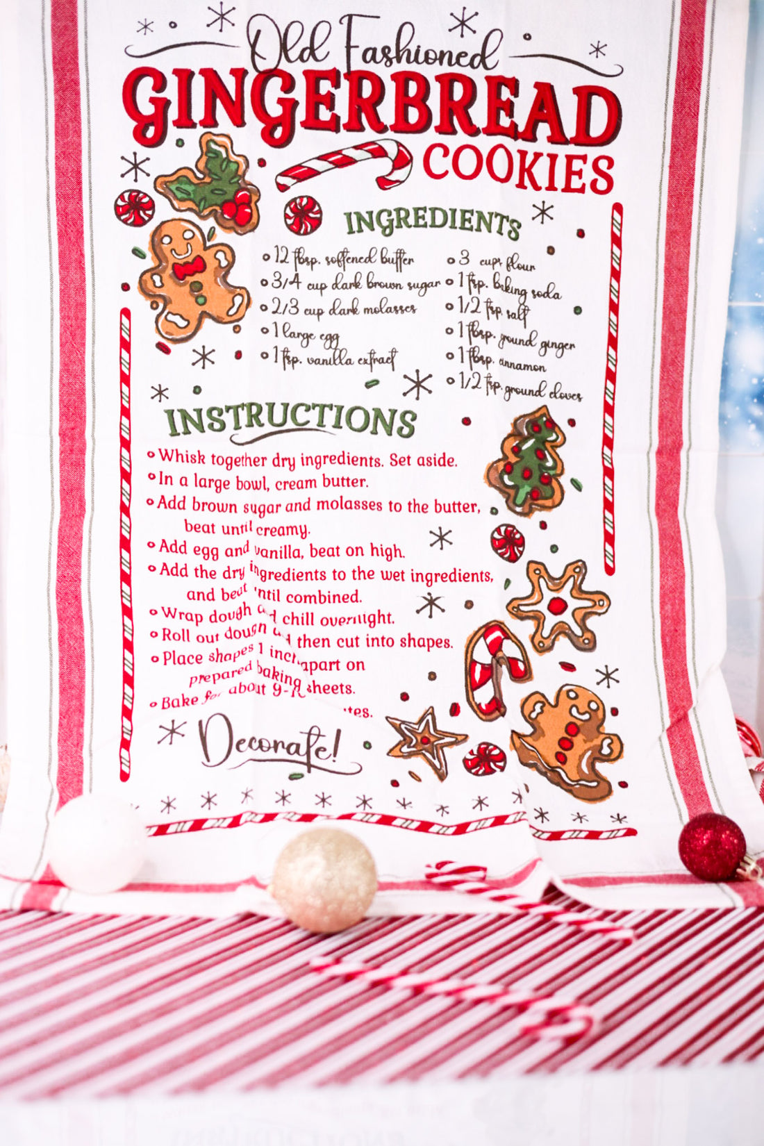 Add a sprinkle of holiday cheer to your kitchen with this flour sack towel featuring a charming gingerbread cookie recipe design. Perfect for baking enthusiasts, it combines festive fun with practical use, making cleanup a sweet part of your holiday tradition!