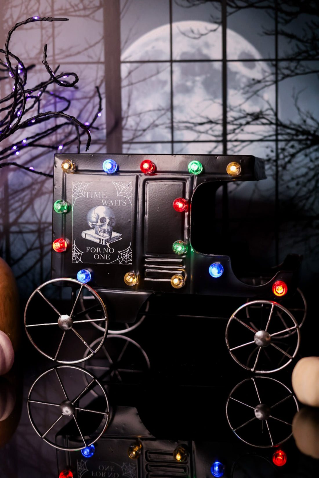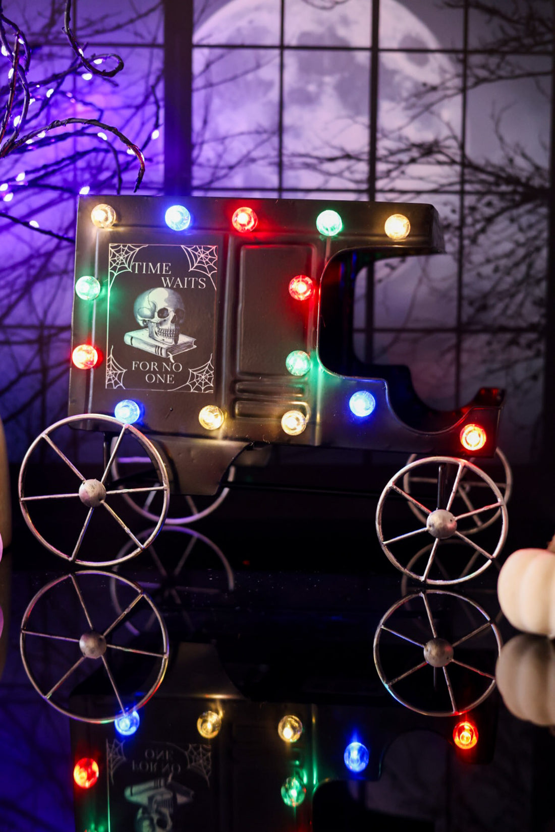 Add a spooky glow to your Halloween setup with the Glowing Black Hearst Tabletop Decor. Featuring eerie glowing lights along the edges and a bold skull graphic, it reminds everyone that "time waits for no one." Perfect for setting a hauntingly fun atmosphere at any gathering.