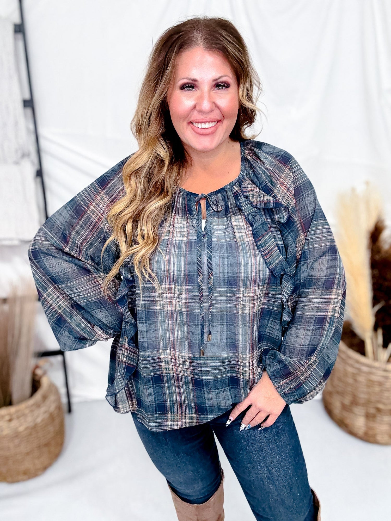 Embrace a touch of charm with this Green Plaid Peasant Blouse featuring playful ruffled trim. The classic green plaid brings timeless style, while the delicate ruffles add a flirty, feminine flair.