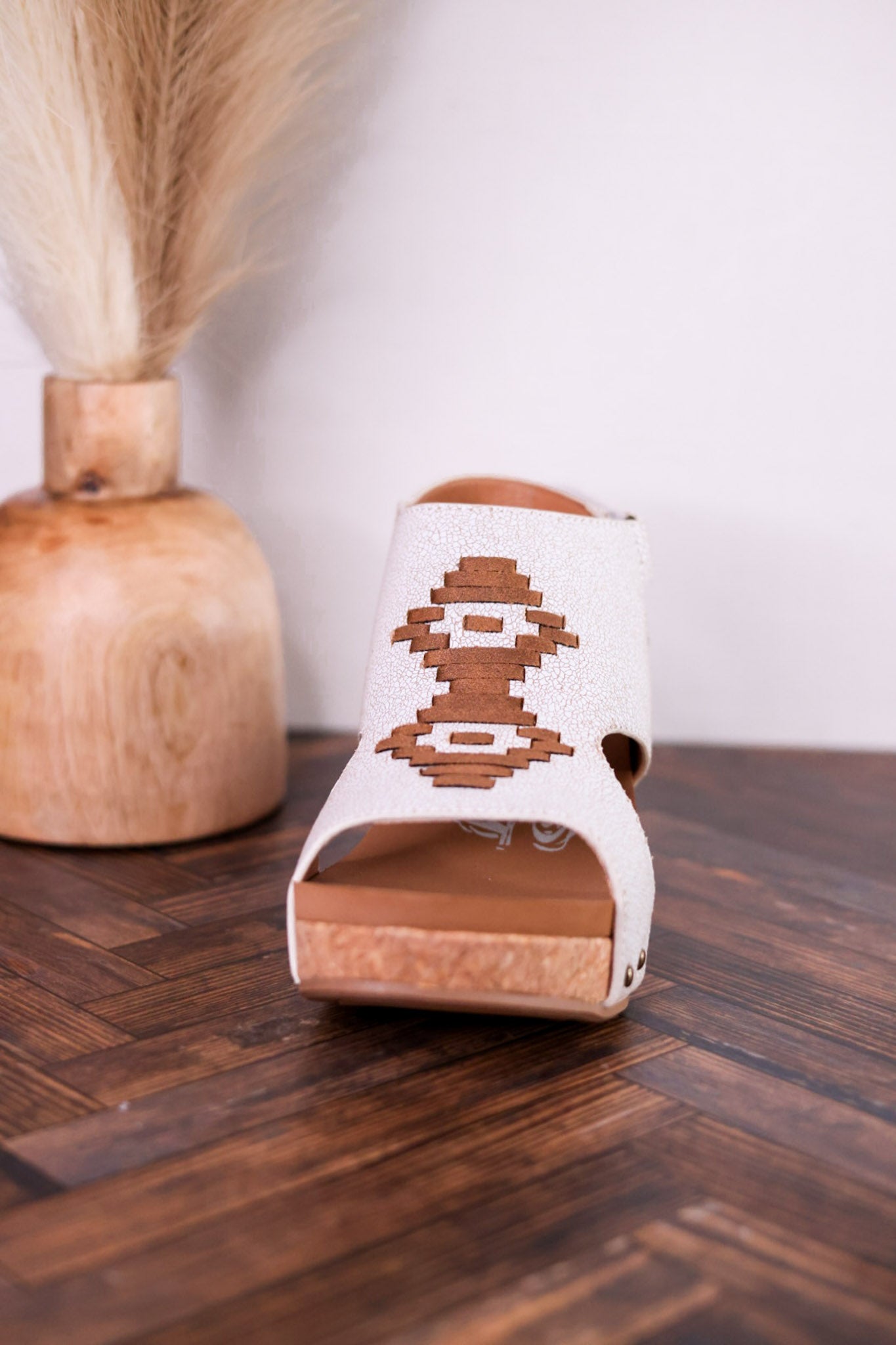 Featuring a creamy crackled body paired with tan Aztec-inspired woven accents, these wedges add a playful pop to any outfit. Slip them on easily with their velcro back strap and enjoy all-day comfort wrapped in a unique, eye-catching design. Perfect for those who love a little artful flair in their stride!