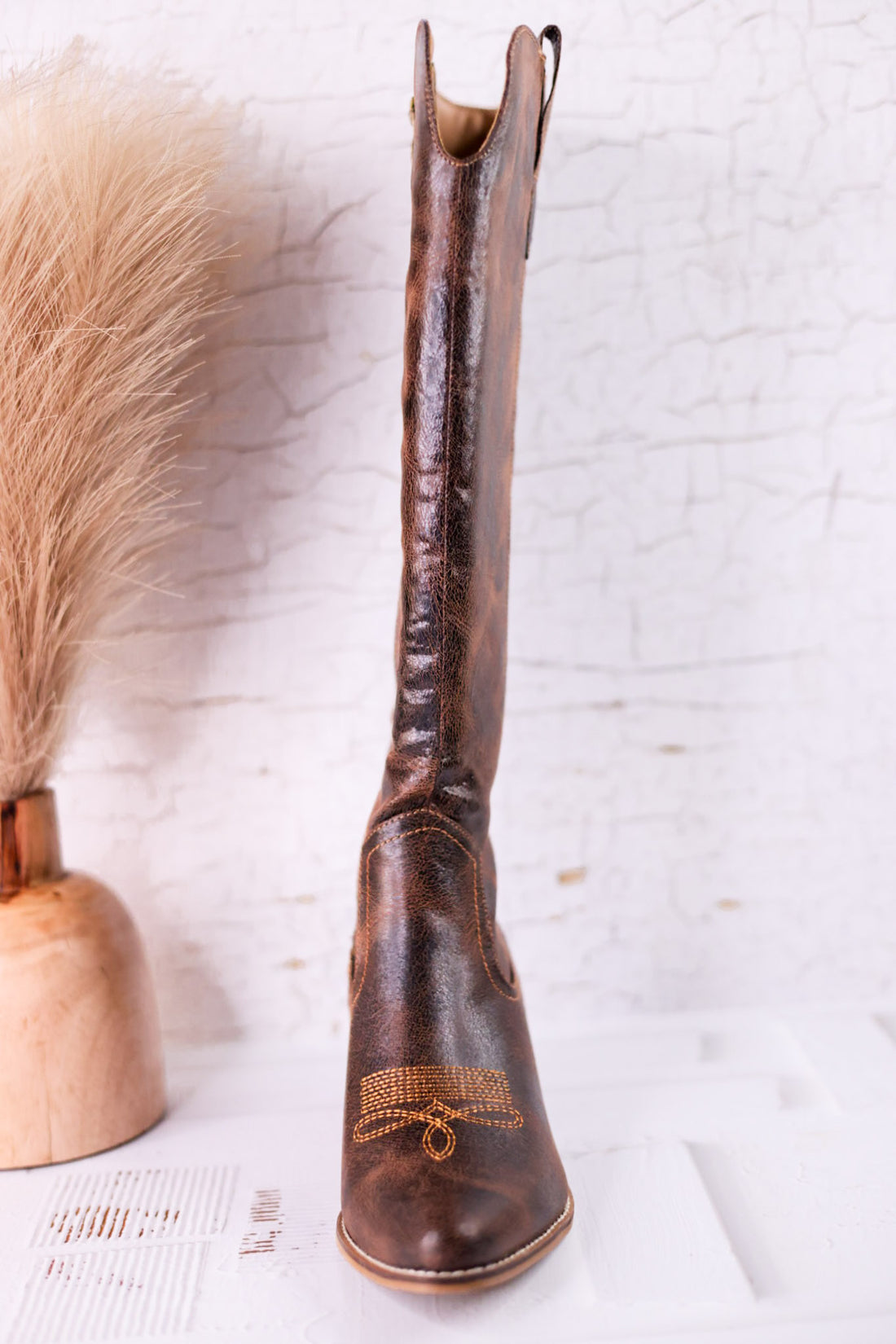 Get ready to shine in these worn-in brown wide calf western boots that blend cool style with all-day ease. Featuring a rugged finish, eye-catching stitching, and a comfy stacked heel, they’re the go-to choice for concerts, game days, or your next country-inspired adventure.