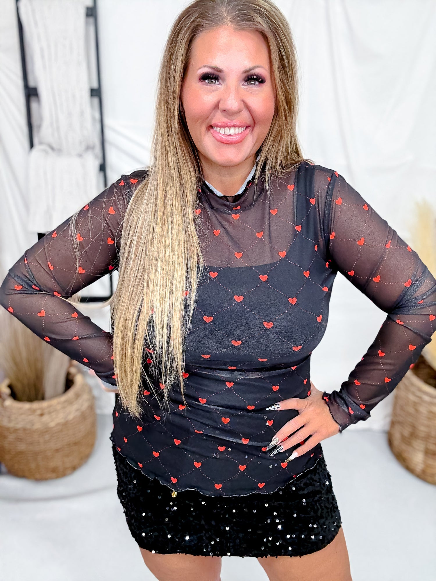 Spread the love with this flirty black mesh long sleeve top, adorned with delicate red hearts connected by lines. Perfect for layering over your favorite basics, it adds a romantic touch to any outfit. Whether you're celebrating Valentine's Day or just want to wear your heart on your sleeve, this piece brings charm and personality to your wardrobe.