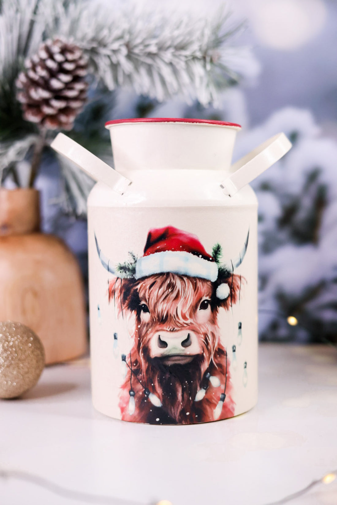 Add a festive touch to your holiday decor with these vintage-style metal milk cans featuring charming Highland cow designs. Choose between two playful styles: one with a cow sporting a Santa hat and Christmas lights, or another adorned with holiday greenery and a cozy scarf.
