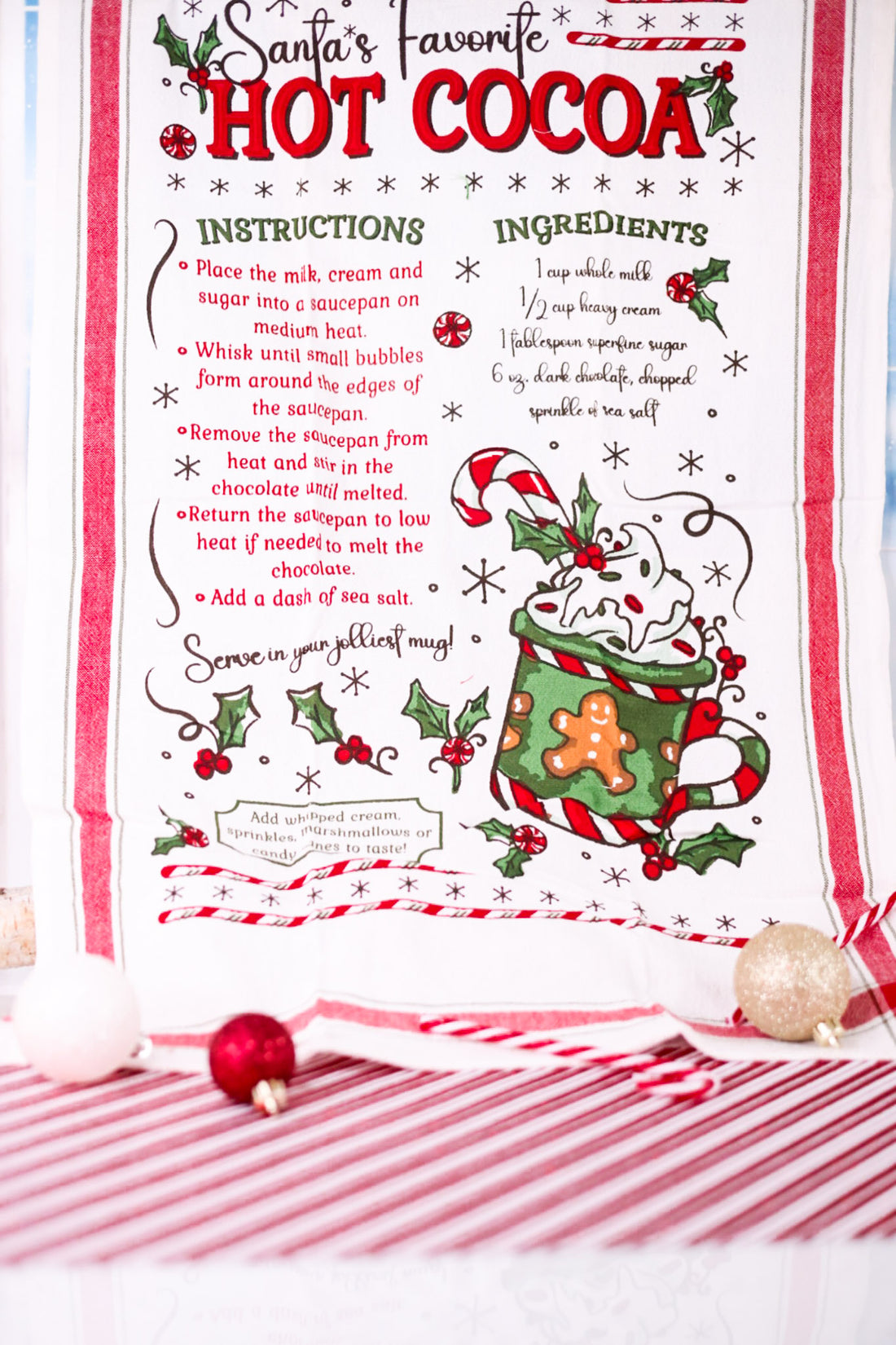 Add a cozy touch to your kitchen this holiday season with the Hot Cocoa Recipe Dish Towel. This white flour sack towel features a festive design showcasing a classic hot cocoa recipe, perfect for sipping by the fire. It’s both decorative and practical, making your kitchen feel merry and bright while keeping your counters dry.