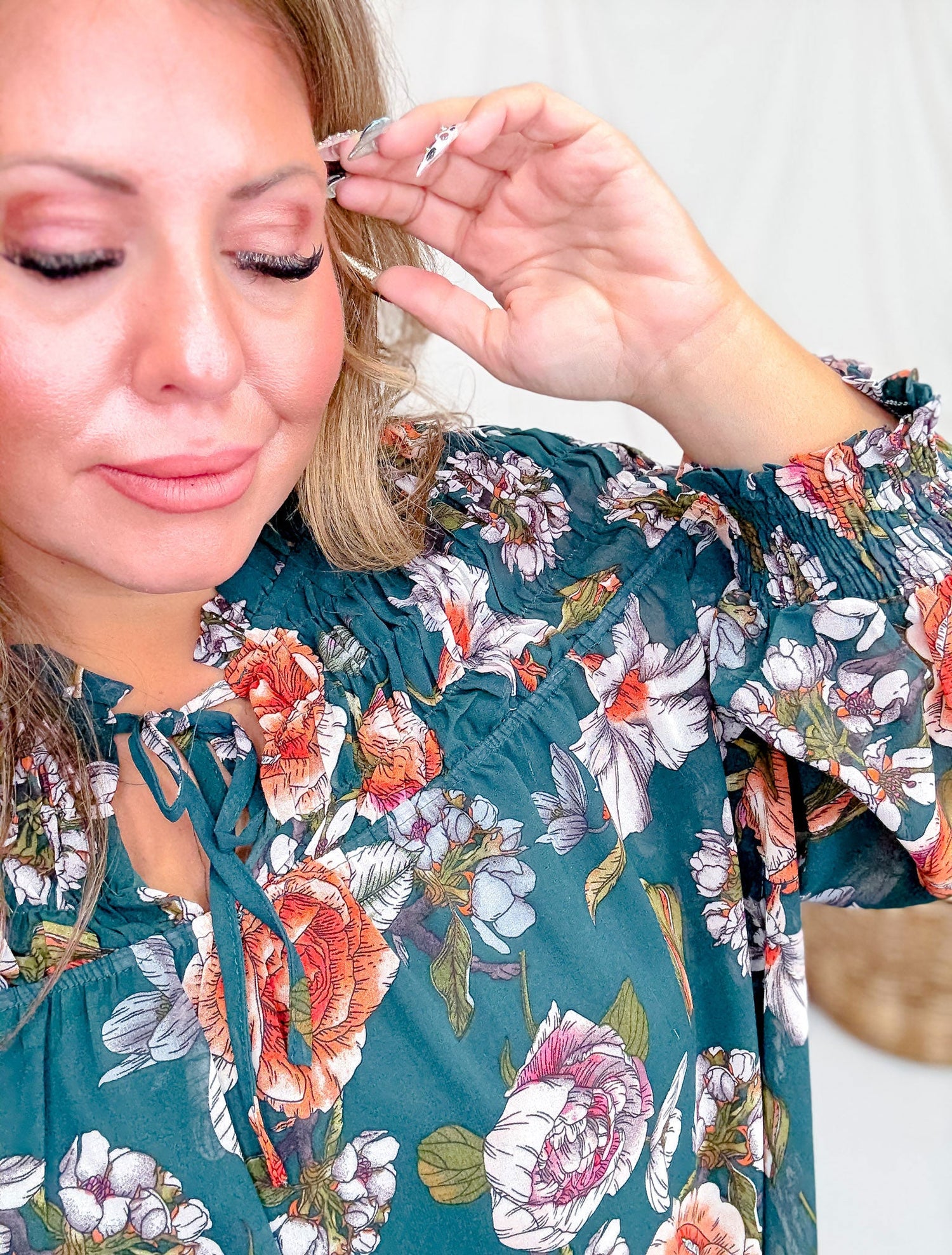 This hunter green long sleeve top features a charming artistic floral print that adds a touch of whimsy to your wardrobe. The smocked bodice ensures a comfortable, flattering fit, while the tie front detail brings a flirty finish. Perfect for brightening up any outfit with a splash of color and personality.