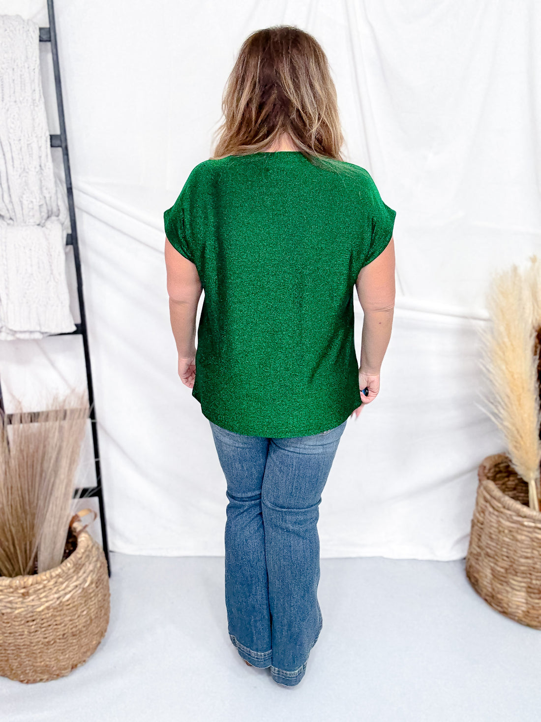 Bring some holiday cheer to your outfit with this glittering green top! With its round neckline and playful cap sleeves, it’s ideal for twirling on the dance floor or standing out at any festive event. Light and stylish, this top keeps the good times going all night long.