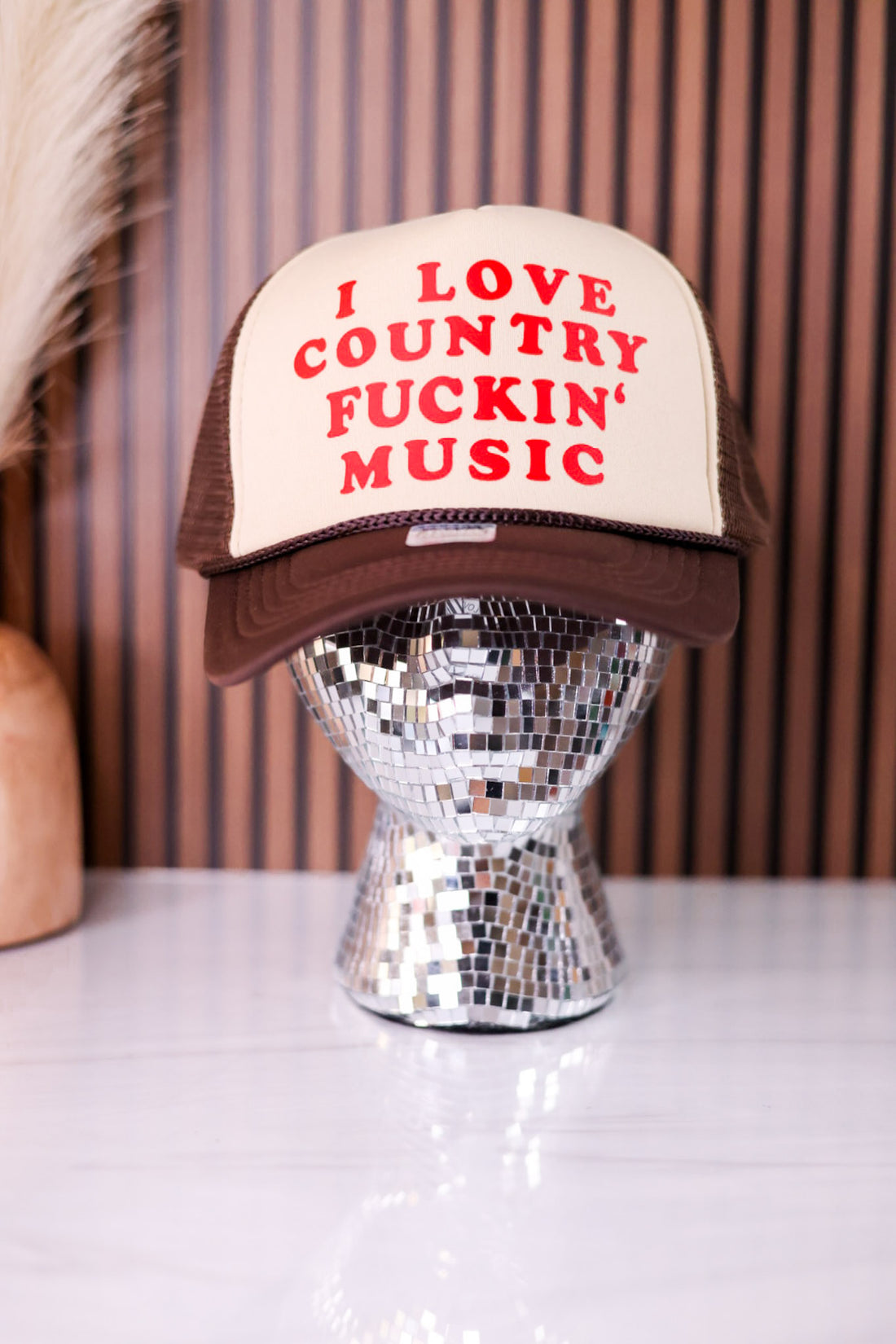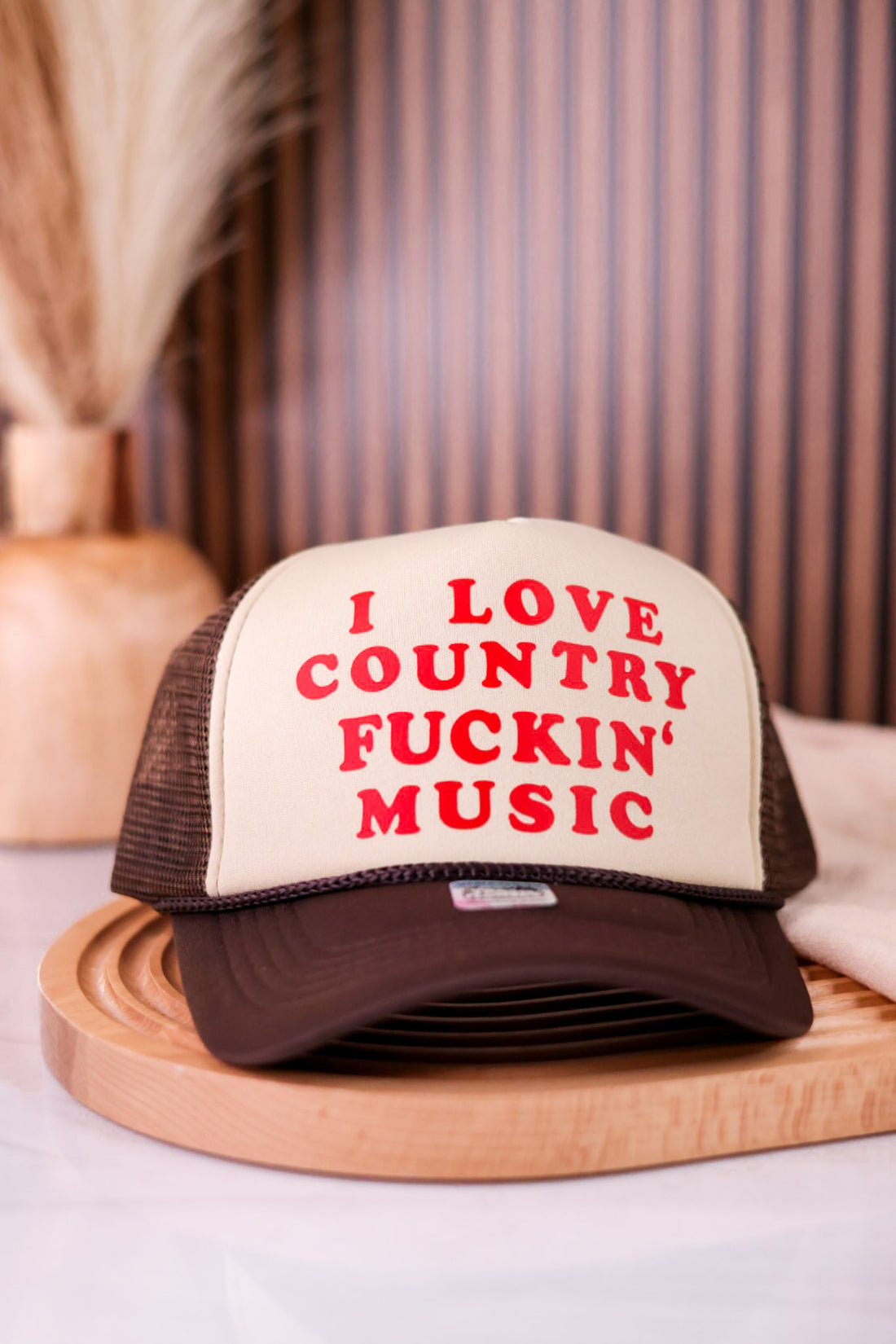 Show your passion for country music with this bold brown and red trucker hat featuring the statement "I Love Country Fuckin' Music." Its snapback design ensures a comfortable, adjustable fit for all-day wear. Crafted to keep you cool with its breathable mesh back, this hat is perfect for concerts, road trips, or casual days out.