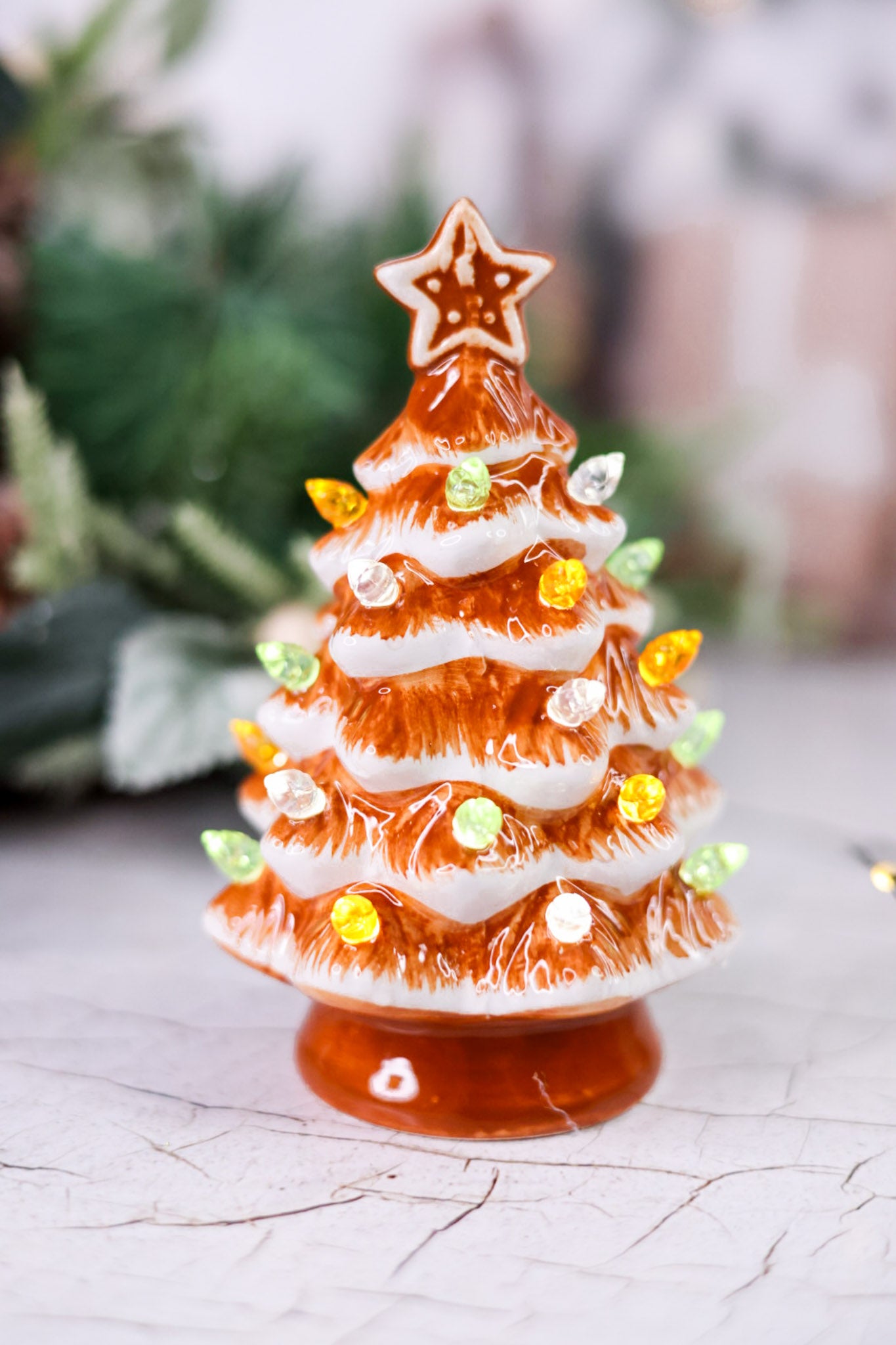 Bring holiday cheer to any room with the Iconic Ceramic Lighted Gingerbread Tree. This charming tabletop Christmas tree features a warm glow that adds cozy ambiance to your festive décor. Its classic gingerbread-inspired design makes it a delightful centerpiece that invites smiles and sweet memories.